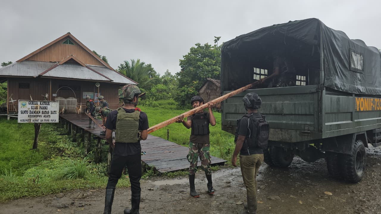Papua, 16 September 2025 – Di tengah keterbatasan dan tantangan pedalaman Papua, secercah harapan hadir berkat Satuan Tugas Pamtas Mobile Yonif 733/Masariku. Memasuki hari ketujuh, mereka terus berjuang memperbaiki jembatan di Gereja Kuasi Paroki Santo Damian, dengan fokus utama pada pembuatan pagar pembatas yang akan memberikan keamanan dan kenyamanan bagi umat.