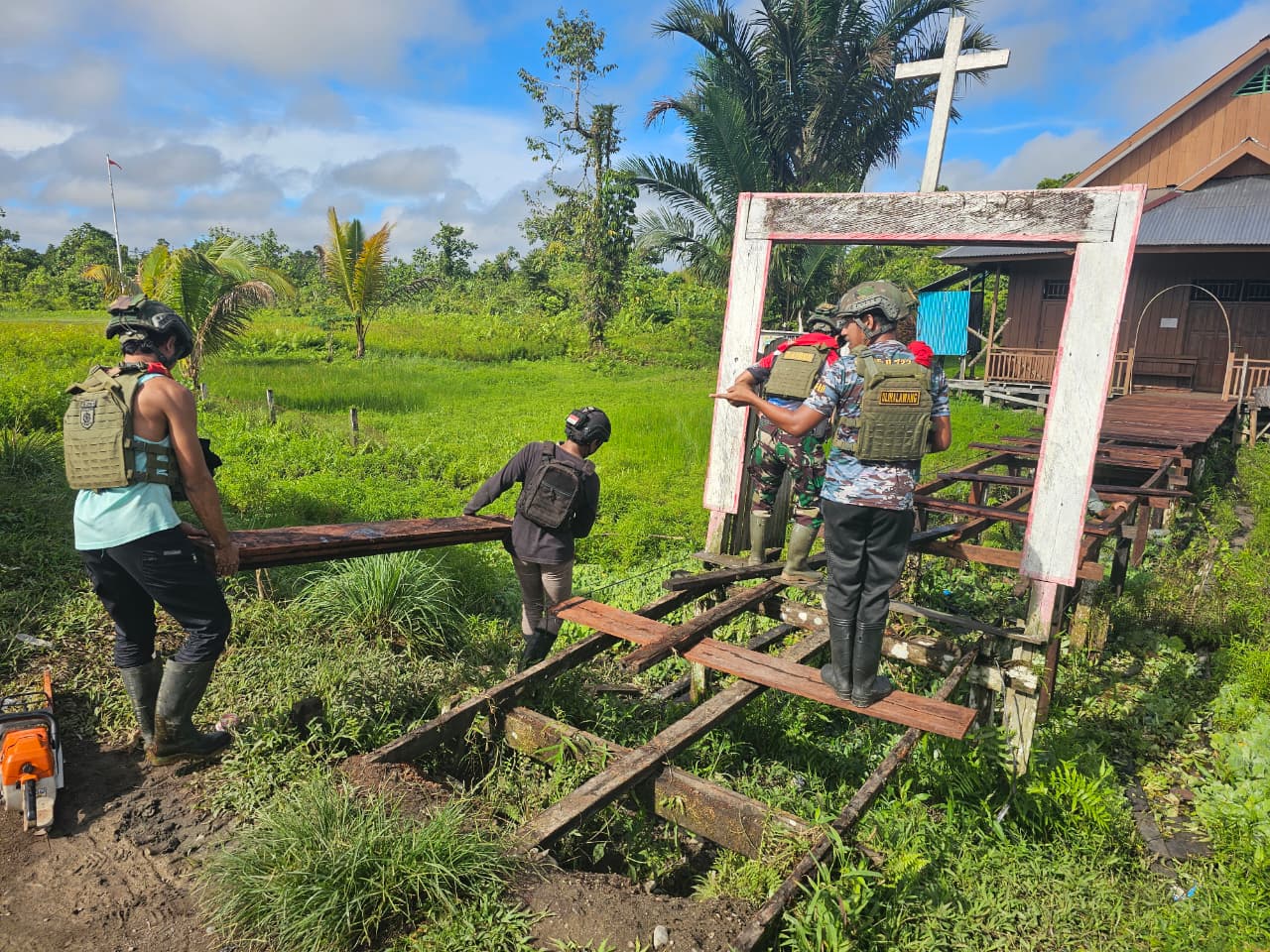 Papua, 11 September 2025 – Di tengah tantangan wilayah perbatasan, Satuan Tugas Pengamanan Perbatasan (Satgas Pamtas) Mobile Yonif 733/Masariku hadir sebagai oase harapan. Kali ini, prajurit Satgas Pamtas Mobile Yonif 733/Masariku melanjutkan perbaikan jembatan yang menghubungkan Kampung Mumugu dengan Gereja Katolik setempat, merajut kembali asa masyarakat untuk kehidupan yang lebih baik.