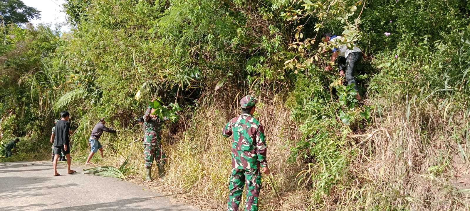 Pada kesempatan tersebut Pelda Yudin Djoni melaksanakan gotong-royong bersama masyarakat membersihkan sampah dan rumput liar di pinggir badan jalan di wilayah binaan tersebut, kondisi tersebut mendorong Babinsa mengajak masyarakat untuk bergotong royong guna melaksanakan pembersihan rumput dan sampah sehingga nantinya membuat kondisi jalan menjadi kelihatan bersih dan terpelihara.