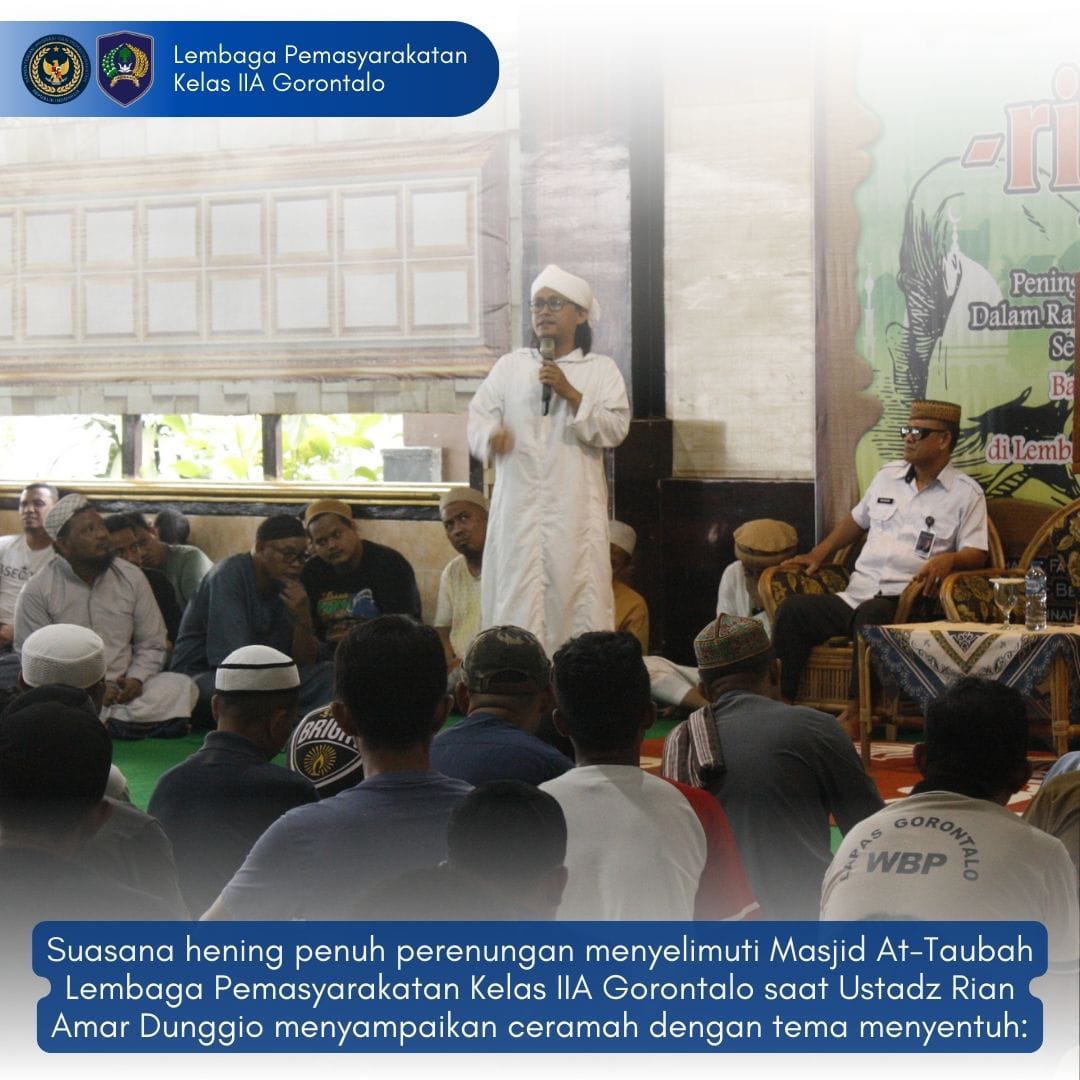 Gorontalo – INFO_PAS – Suasana hening penuh perenungan menyelimuti Masjid At-Taubah Lembaga Pemasyarakatan Kelas IIA Gorontalo saat Ustadz Rian Amar Dunggio menyampaikan ceramah dengan tema menyentuh hati Warga Binaan yang hadir, Senin (19/05).