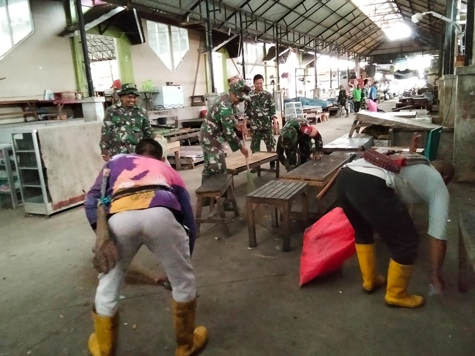 Enrekang – Anggota Koramil 02/Enrekang, bersama masyarakat setempat, Melaksanakan karya bakti pembersihan Pasar Sentral dari tanah, rumput dan sampah lainnya sepanjang 400 meter di Lingk. Bungawali Kel. Jupandang Kec. Enrekang Kab. Enrekang, Kamis 26/06/2025
