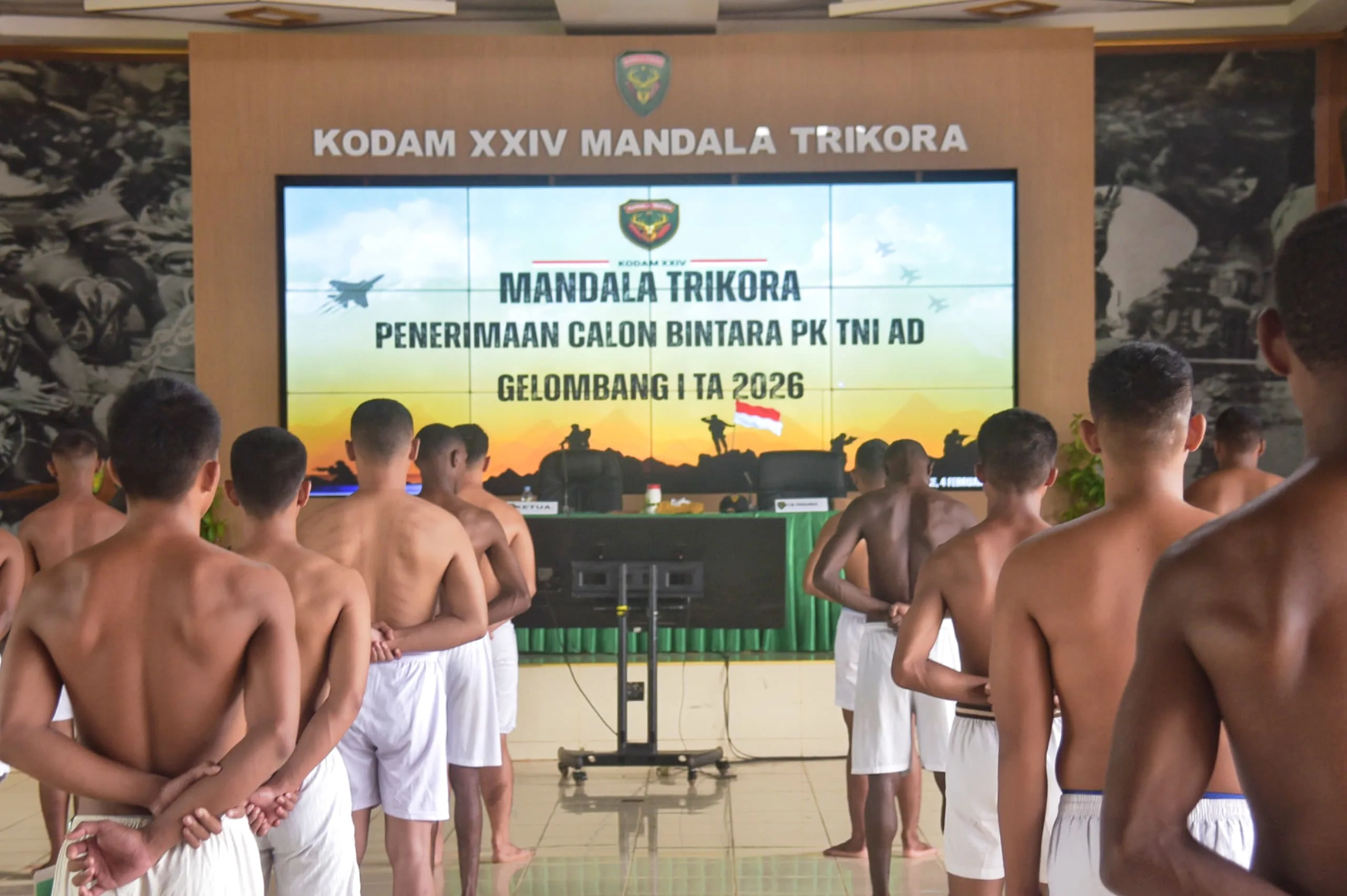 Merauke, Papua Selatan – Kepala Staf Kodam (Kasdam) XXIV/Mandala Trikora Brigjen TNI Eventius Teddy Danarto memimpin pelaksanaan Sidang Parade Daerah Penerimaan Prajurit TNI Angkatan Darat Calon Bintara Gelombang I Tahun Anggaran 2026. Kegiatan tersebut diselenggarakan di Aula LB. Moerdani, Makodam XXIV/Mandala Trikora, Rabu (04/02/2026).