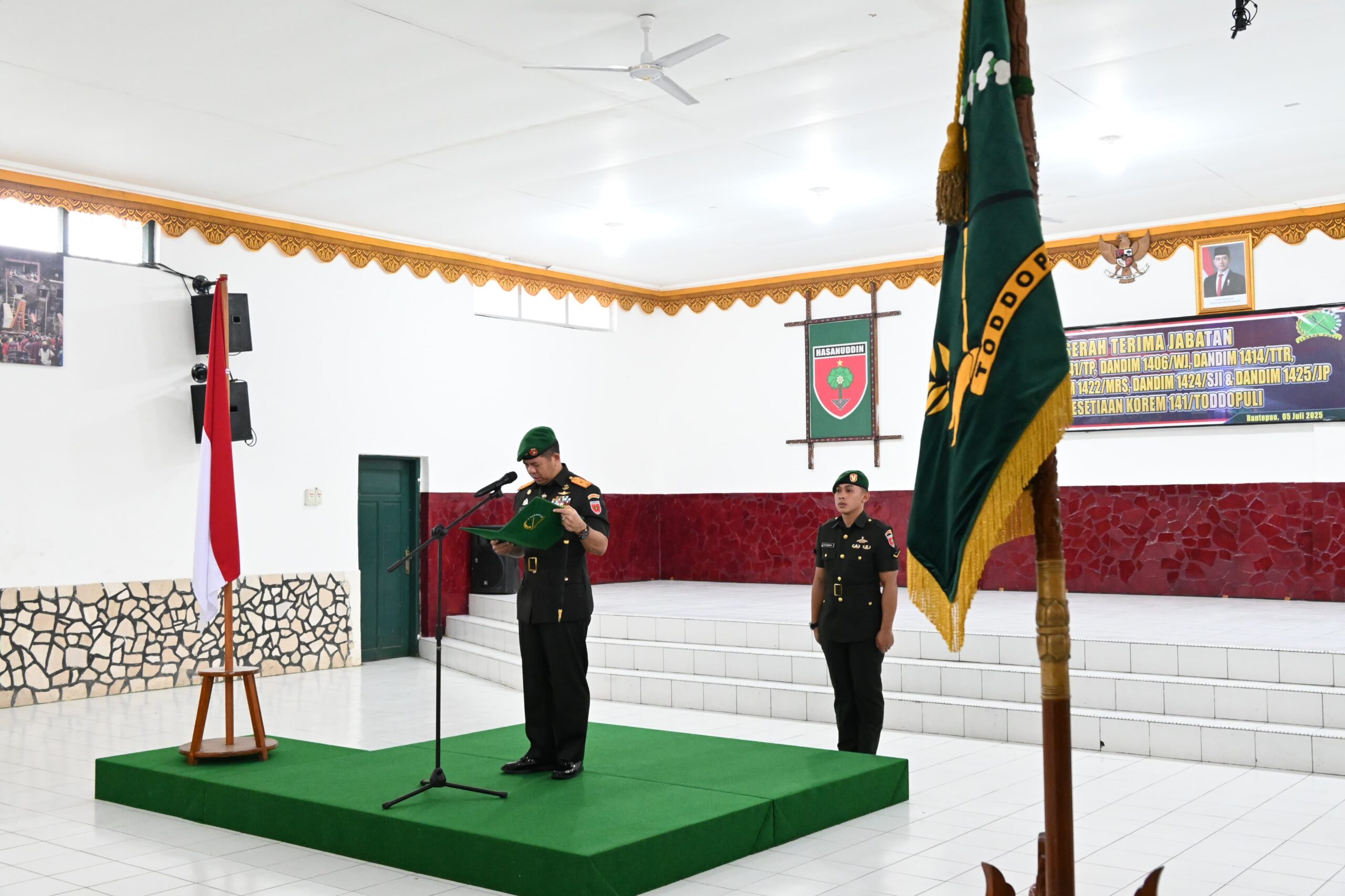 Toraja – Komandan Korem 141/Tp Brigjen TNI Andre Clift Rumbayan, S.Sos., M.M. memimpin upacara Serah Terima Jabatan Kasiter Kasrem 141/Tp dan Enam Dandim Jajaran Korem 141/Tp bertempat di Aula Pongtiku Kodim 1414/Tator, Jl. Pongtiku No. 64, Kel. Rantepao, Kec. Rantepao Kab. Toraja Utara, Sabtu (05/07/2025)