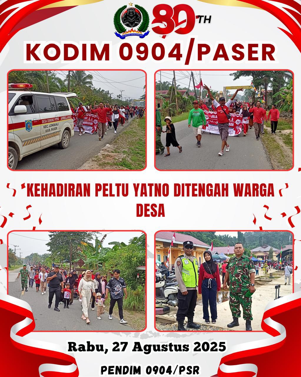 Kodim 0904/Paser, Korem 091/ASN, Kodam VI/Mlw – Babinsa Koramil 0904-03/Long Kali Peltu Yatno melaksanakan Pengamanan Jalan Santai di Desa Gunung Putar Kec.Long Kali, Rabu (27/8/2025).
