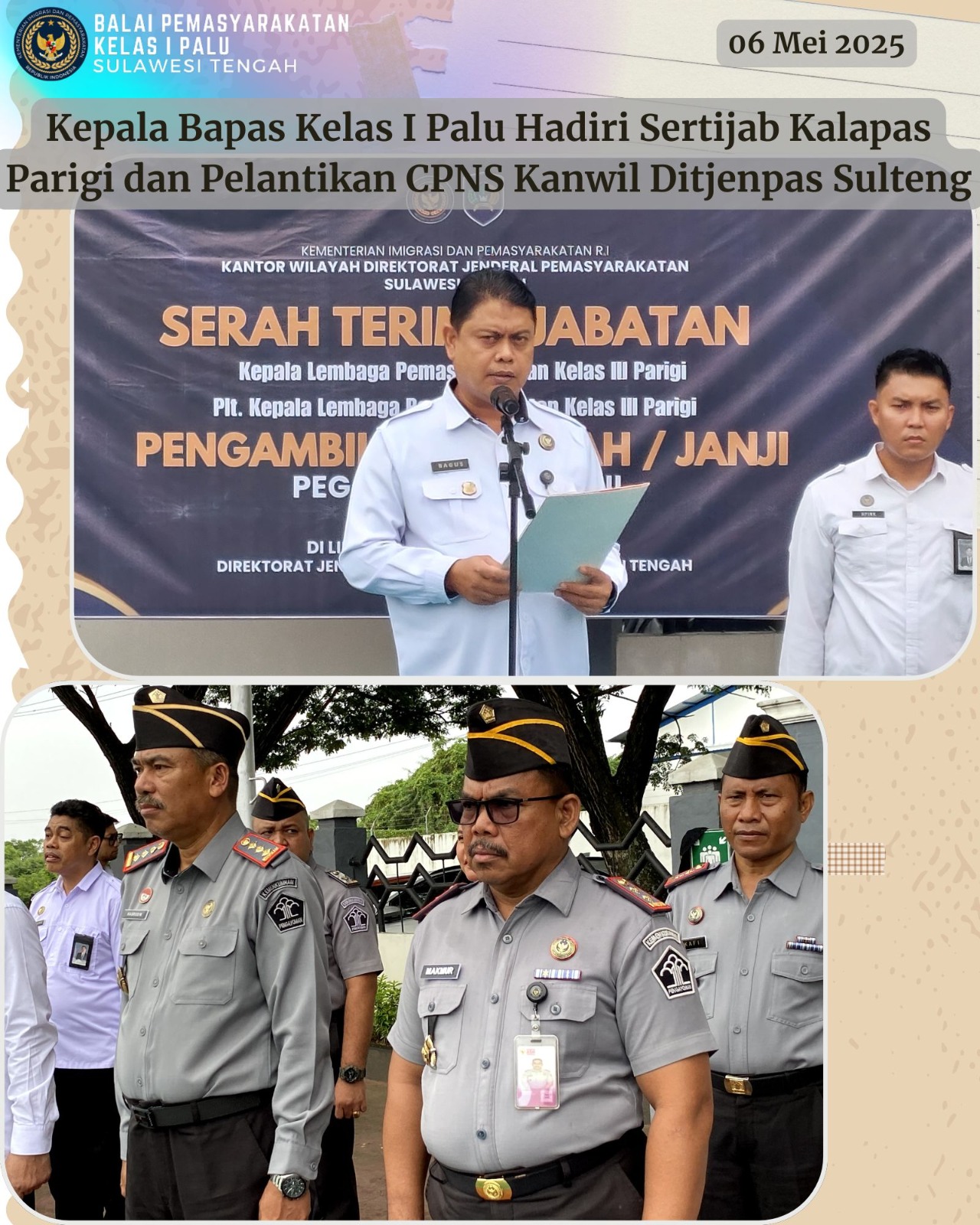 PALU – Kepala Balai Pemasyarakatan (Bapas) Kelas I Palu, Hasrudin, turut menghadiri kegiatan serah terima jabatan Kepala Lembaga Pemasyarakatan (Lapas) Kelas III Parigi dan pelantikan serta pengambilan sumpah Calon Pegawai Negeri Sipil (CPNS) di lingkungan Kantor Wilayah Direktorat Jenderal Pemasyarakatan (Kanwil Ditjenpas) Sulawesi Tengah. Acara berlangsung di halaman Kantor Wilayah Ditjenpas Sulawesi Tengah pada pukul 08.00 WITA.