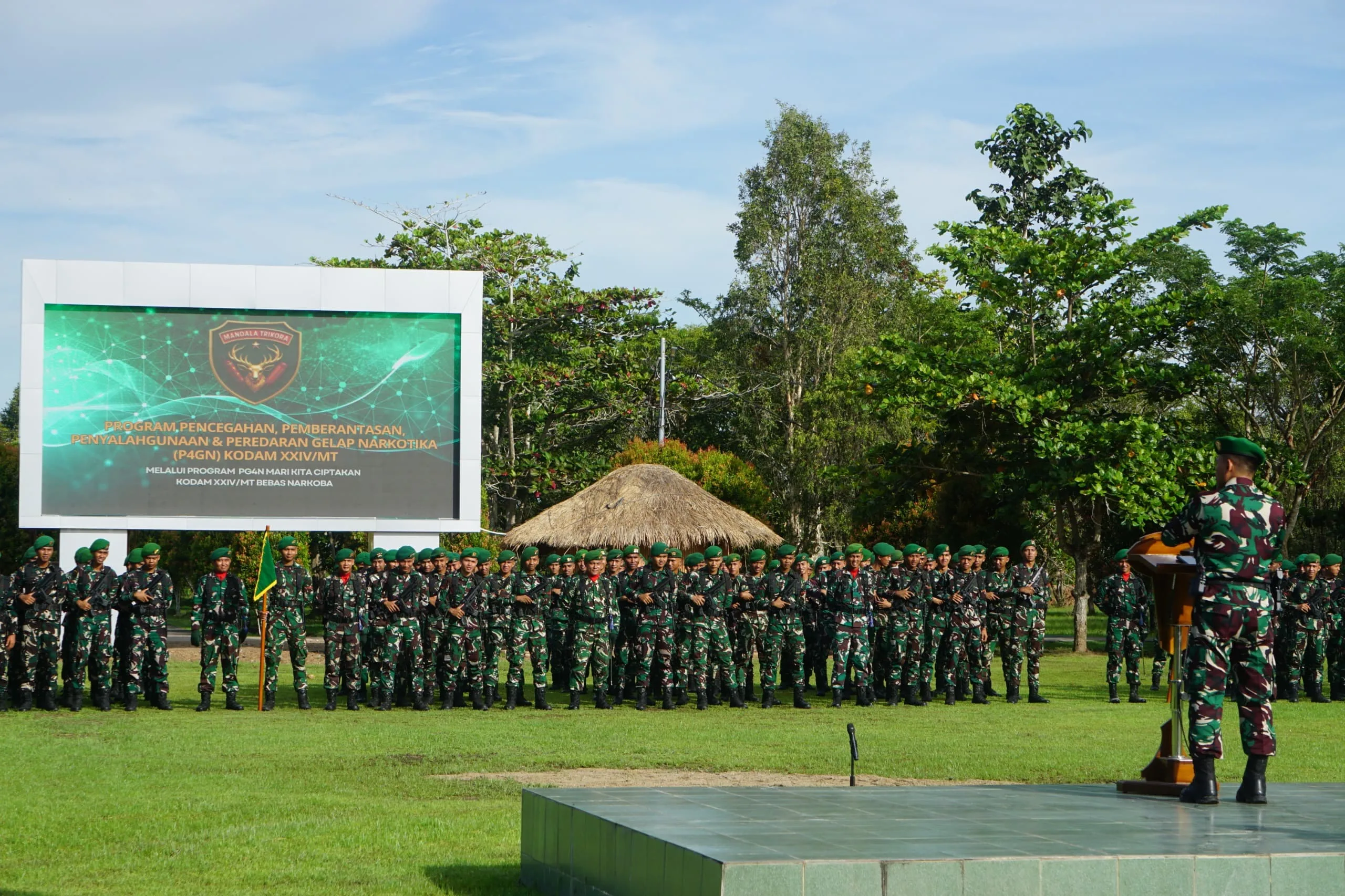 Merauke – Kodam XXIV/Mandala Trikora kembali menunjukkan komitmen nyata dalam memerangi bahaya narkotika dengan menggelar kegiatan Penyuluhan Pencegahan, Pemberantasan, Penyalahgunaan, dan Peredaran Gelap Narkoba (P4GN) Semester I Tahun Anggaran 2026. Kegiatan ini dipusatkan di Lapangan Upacara Makodam XXIV/Mandala Trikora, Senin (05/01/2026).