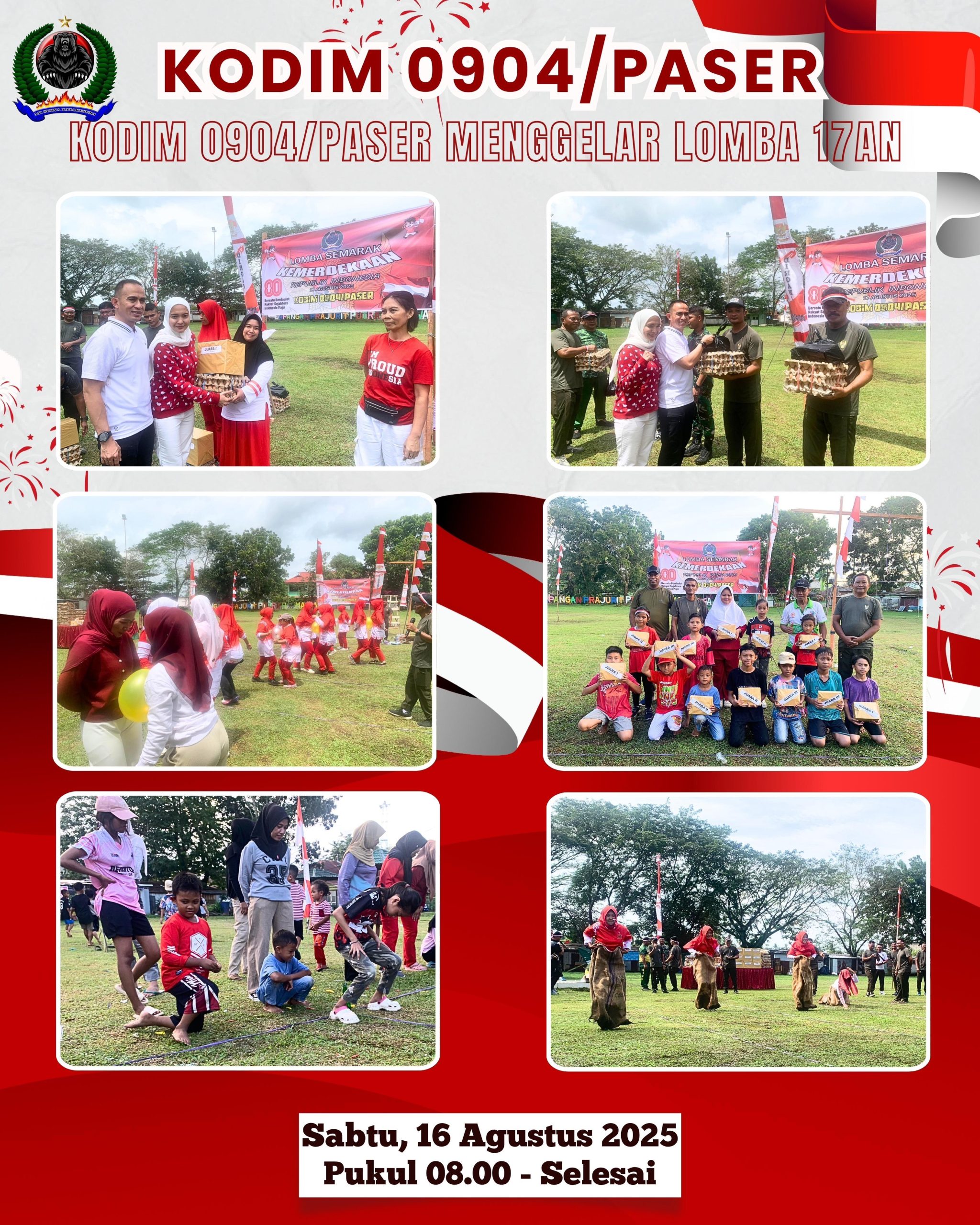Kodim 0904/Psr, Korem 091/ASN, Kodam VI/Mlw – Kodim 0904/Paser telah melaksanakan kegiatan Lomba 17an pada hari Sabtu tanggal 16 Agustus 2025 dalam rangka Memperingati Hari Ulang Tahun Republik Indonesia Ke-80 bertempat di Lapangan Prajurit jalan R. Suprapto, Kel. Tanah Grogot, Kec. Tanah Grogot, Kab. Paser, Senin (18/08/2025).