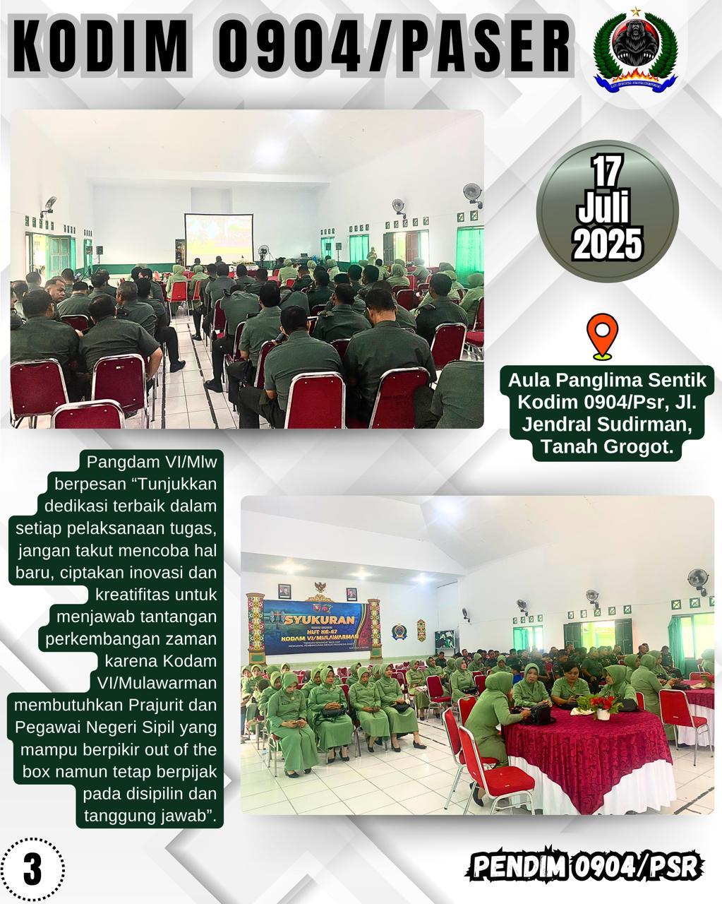 Kodim 0904/Psr, Korem 091/ASN, Kodam VI/Mlw – Seluruh Prajurit Kodim 0904/Paser, PNS beserta anggota Persit KCK Cabang XVII Dim 0904/Psr melaksanakan kegiatan Syukuran HUT KE-67 Kodam VI/Mulawarman secara Daring bertempat di Aula Panglima Sentik Kodim 0904/Psr, Jl. Jendral Sudirman, Tanah Grogot.