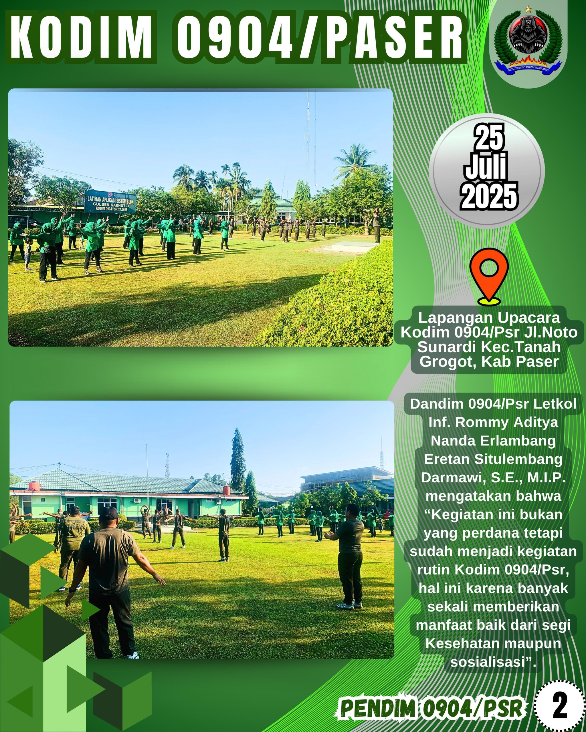 Dandim 0904/Psr Letkol Inf. Rommy Aditya Nanda Erlambang Eretan Situlembang Darmawi, S.E., M.I.P. mengatakan bahwa “Kegiatan ini bukan yang perdana tetapi sudah menjadi kegiatan rutin Kodim 0904/Psr, hal ini karena banyak sekali memberikan manfaat baik dari segi Kesehatan maupun sosialisasi”.