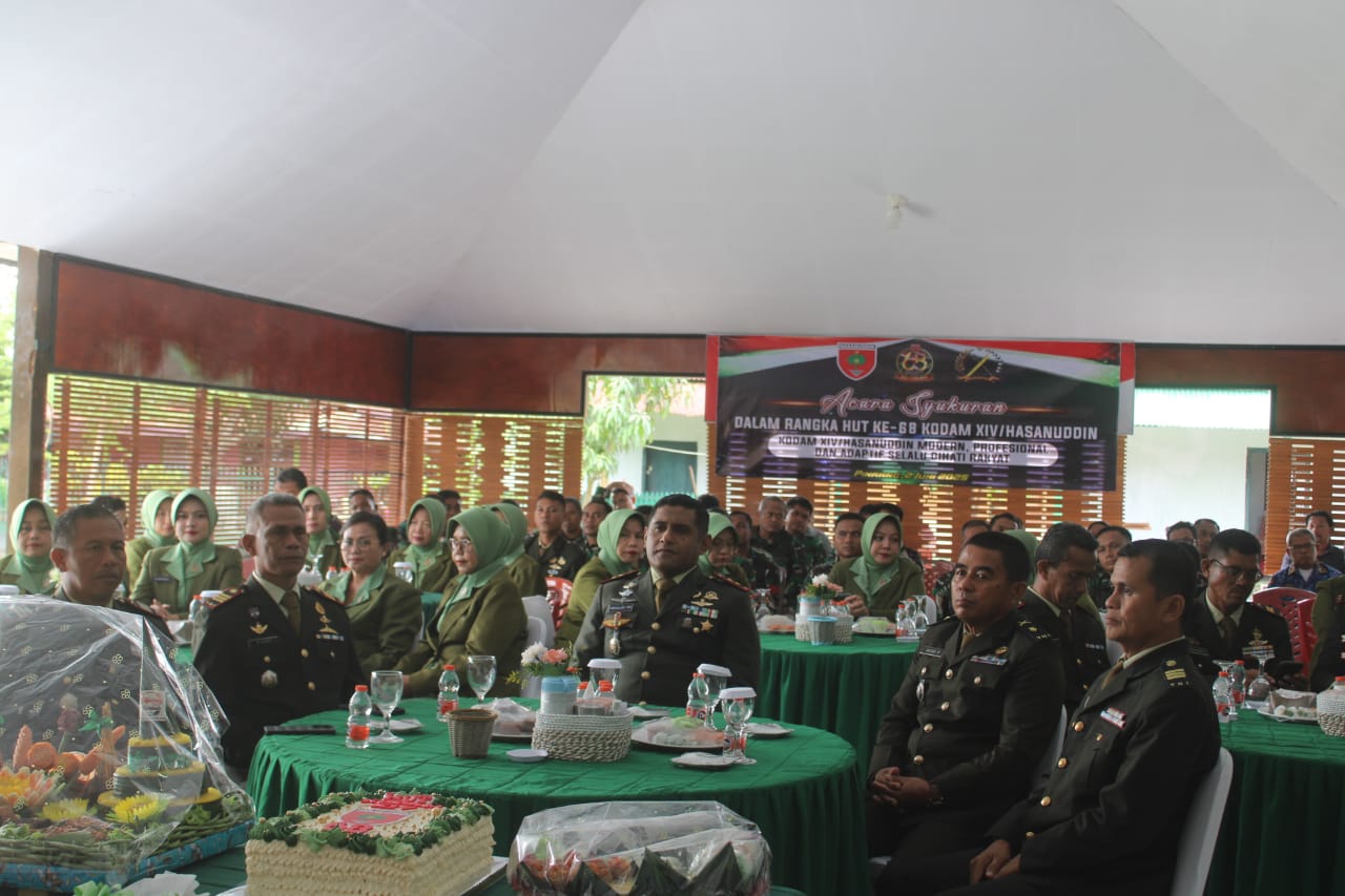 Pinrang_ Suasana hangat penuh kebersamaan menyelimuti Pendopo Kodim 1404/Pinrang saat digelar acara syukuran dalam rangka memperingati Hari Ulang Tahun ke-68 Kodam XIV/Hasanuddin yang tahun ini mengusung tema: “Kodam XIV/Hasanuddin yang Modern, Profesional, dan Adaptif, Selalu di Hati Rakyat.”, Senin (02/06/2025).