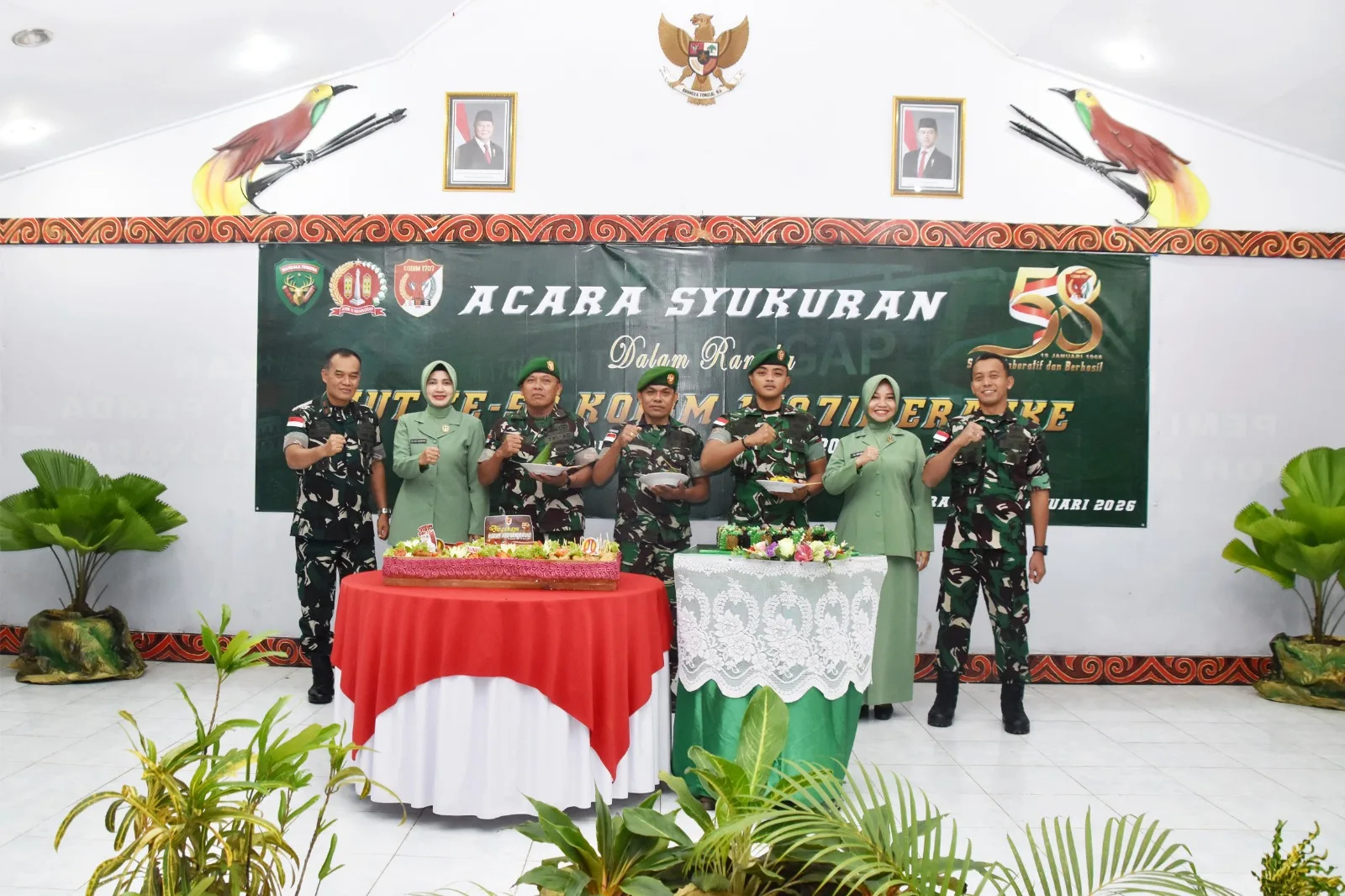 Merauke – Papua Selatan. Kodim 1707/Merauke menggelar acara Syukuran Hari Ulang Tahun (HUT) ke-58 Tahun 2026 pada Selasa, 20 Januari 2026, bertempat di Aula Anim Ha Makodim 1707/Merauke, Jalan Raya Mandala, Kabupaten Merauke. Kegiatan berlangsung khidmat dan penuh kebersamaan. Acara diawali pemutaran video singkat yang menampilkan berbagai kegiatan Kodim 1707/Merauke baik program terpusat maupun kegiatan teritorial yang bersinergi dengan Pemerintah Daerah serta instansi terkait.