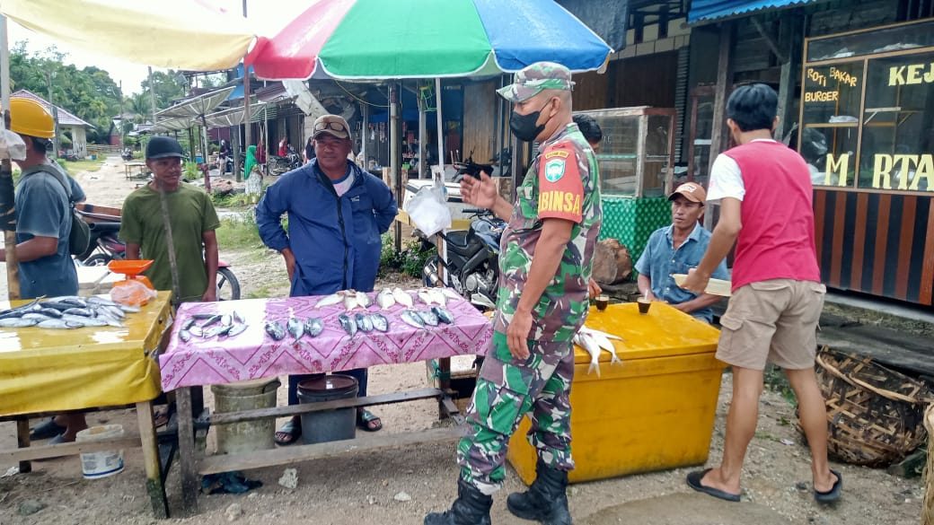 Babinsa juga berkomunikasi dengan masyarakat setempat. Ini sebagai cara agar mengetahui situasi kesulitan yang dialami masyarakat khususnya para pedagang di pasar tersebut.