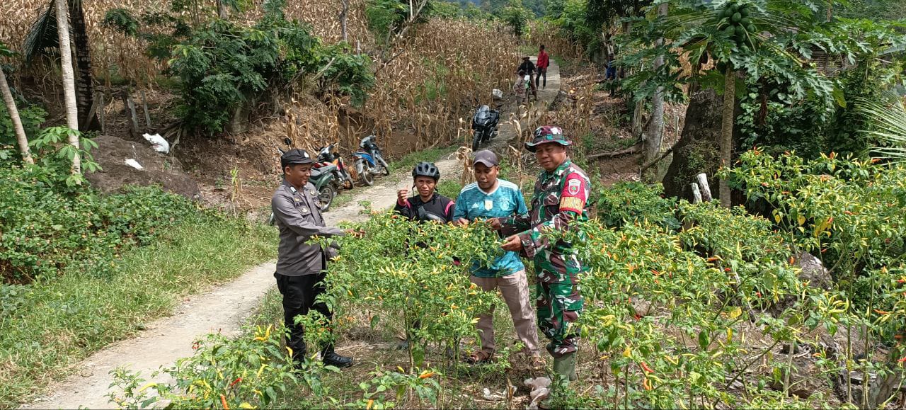 Pinrang_ Babinsa Koramil-05/Patampanua Kodim 1404/Pinrang Serma Muhammad Hatta bersama Bhabinkamtibmas Brigpol Andy melaksanakan komsos sekaligus memberi motivasi kepada petani cabe di Dusun Tarokko Desa Batulappa Kecamatan Batulappa Kabupaten Pinrang, Selasa (02/09/2025).