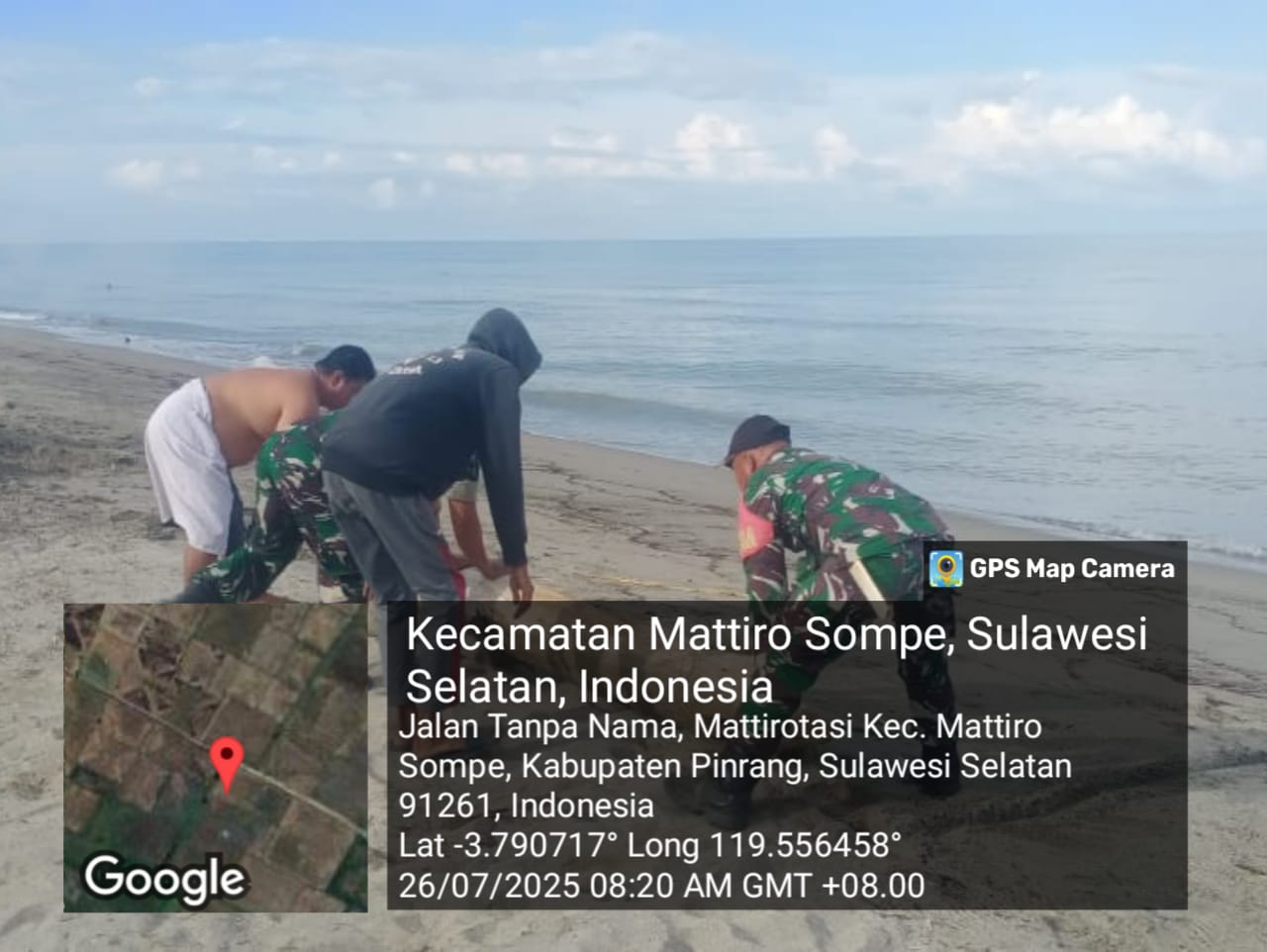 Pinrang_ Peduli kebersihan pantai, Babinsa jajaran Koramil-02/Mattiro Sompe Kodim 1404/Pinrang bersama warga dan Perangkat Desa melaksanakan kegiatan pelestarian alam dengan melakukan pembersihan pantai wisana Ammani di Desa Mattiro Tasi Kecamatan Mattiro Sompe Kabupaten Pinrang, Sabtu (26/07/2025).