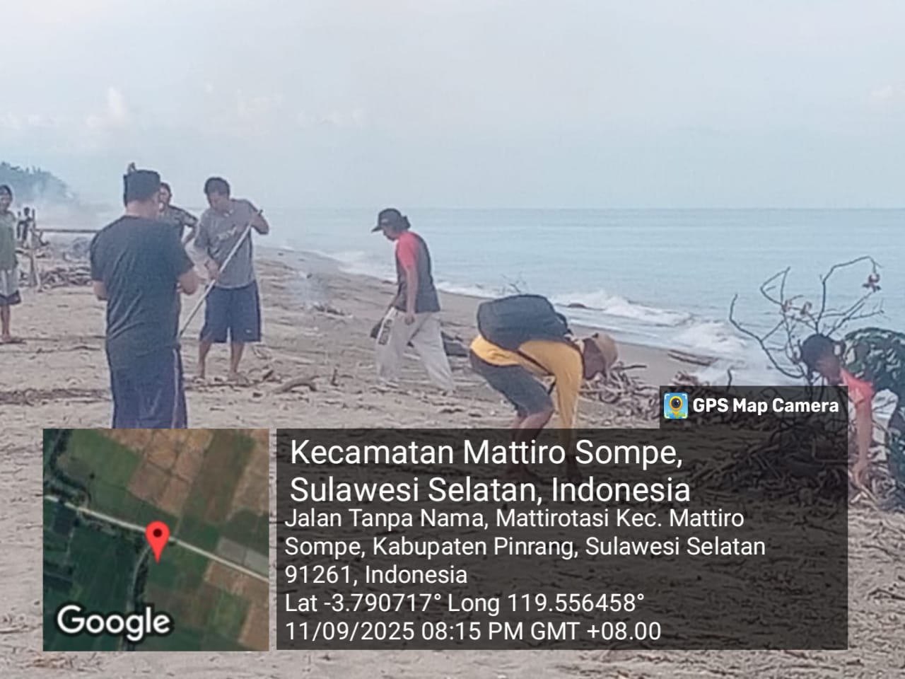 Pinrang_ Peduli kebersihan pantai, Babinsa jajaran Koramil-02/Mattiro Sompe Kodim 1404/Pinrang bersama warga dan Perangkat Desa melaksanakan kegiatan pelestarian alam dengan melakukan pembersihan pantai wisana Ammani di Desa Mattiro Tasi Kecamatan Mattiro Sompe Kabupaten Pinrang, Kamis (11/09/2025).