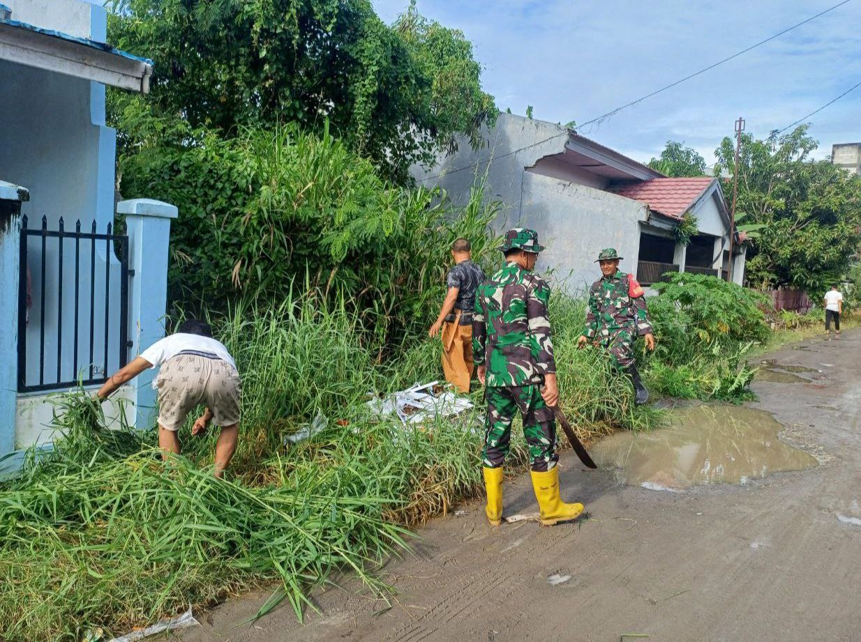 Pinrang_ Babinsa jajaran Koramil-04/Paleteang Kodim 1404/Pinrang bersama warga melaksanakan kegiatan karya bakti membersihkan jalan dan saluran air di BTN Palem Hijau Lingkungan Sekkang Kelurahan Bentengnge Kecamatan Watang Sawitto Kabupaten Pinrang, Rabu (23/04/2025).