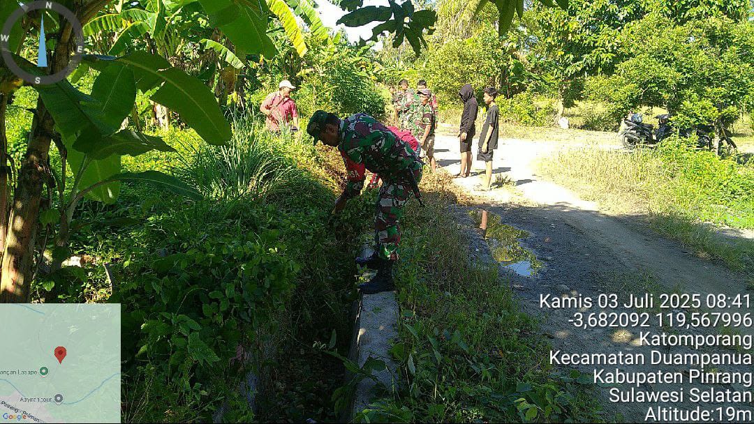 Pinrang_ Dipimpin oleh Danramil-06/Duampanua Kodim 1404/Pinrang Kapten Inf Alimuddin Cappa, Personel Koramil ajak warga melaksanakan kerja bakti membersihkan saluran air di Dusun Mallang Desa Katomporang Kecamatan Duampanua Kabupaten Pinrang, Kamis (03/07/2025).