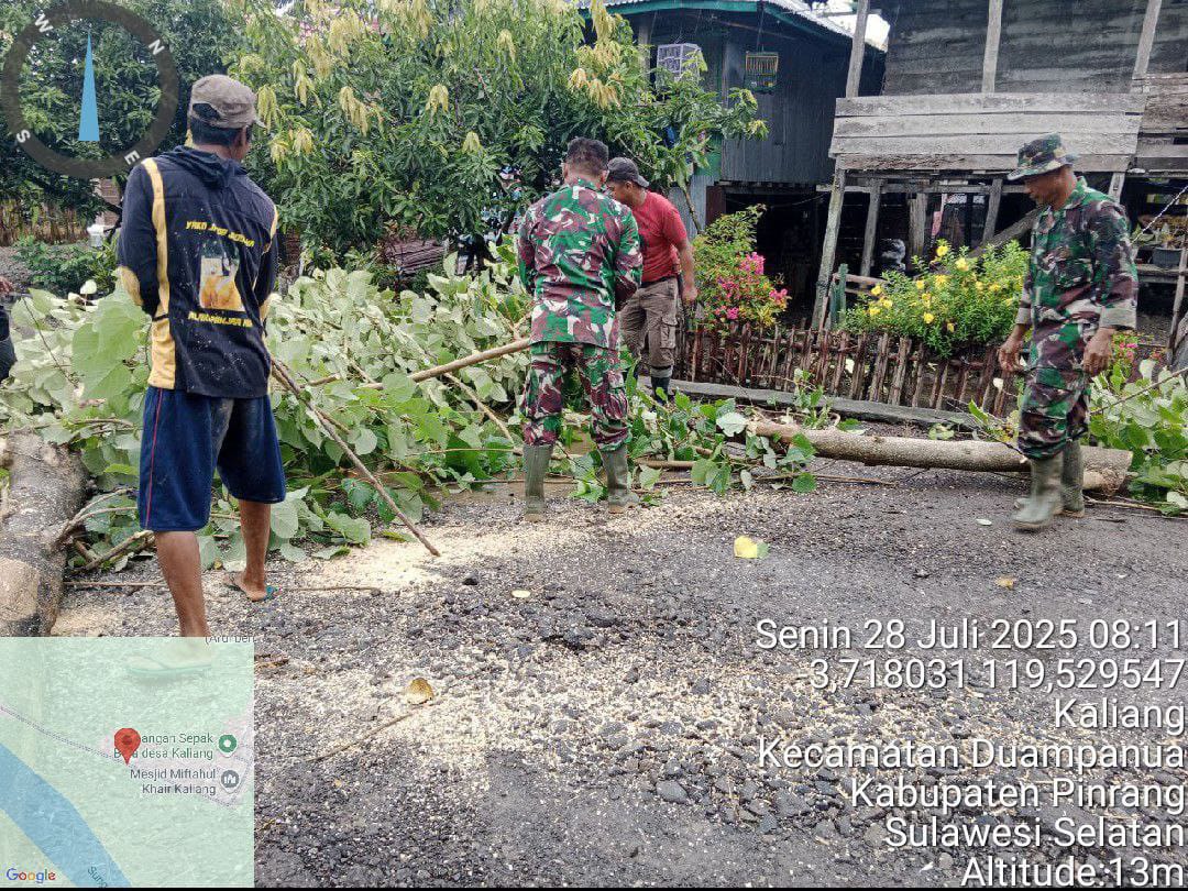Pinrang_ Babinsa Koramil-06/Duampanua Kodim 1404/Pinrang melaksanakan kerja bakti pembersihan lingkungan yaitu memotong dahan dan ranting pohon yang ada di sepanjang jalan Desa Kaliang Kecamatan Duampanua Kabupaten Pinrang, Senin (28/070/2025).