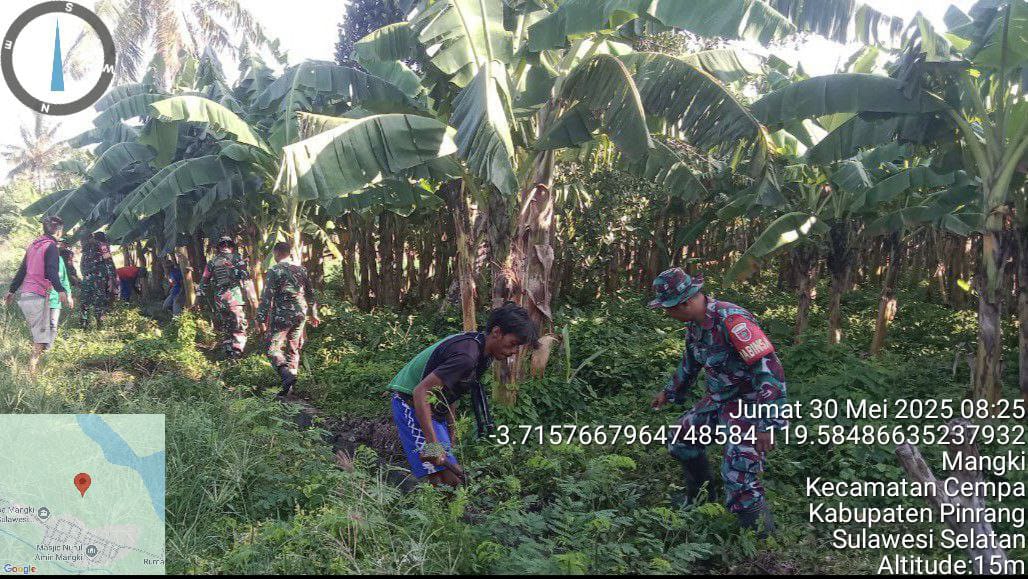 Pinrang_ Babinsa jajaran Koramil-06/Duampanua Kodim 1404/Pinrang melaksanakan kegiatan gotong-royong bersama warga Desa dengan sasaran membersihkan saluran irigasi di Dusun Linoe Desa Mangki Kecamatan cempa Kabupaten Pinrang, Minggu (01/06/2025).