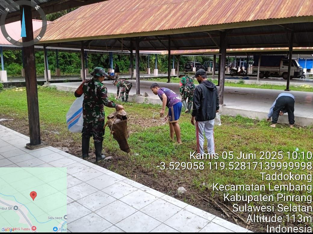 Pinrang_ Peduli terhadap kebersihan Lingkungan, Babinsa Koramil-07/Lembang Kodim 1404/Pinrang beserta warga melaksanakan aksi pembersihan pasar Tuppu di Kelurahan Tadokkong Kecamatan Lembang Kabupaten Pinrang, Kamis (05/06/2025).