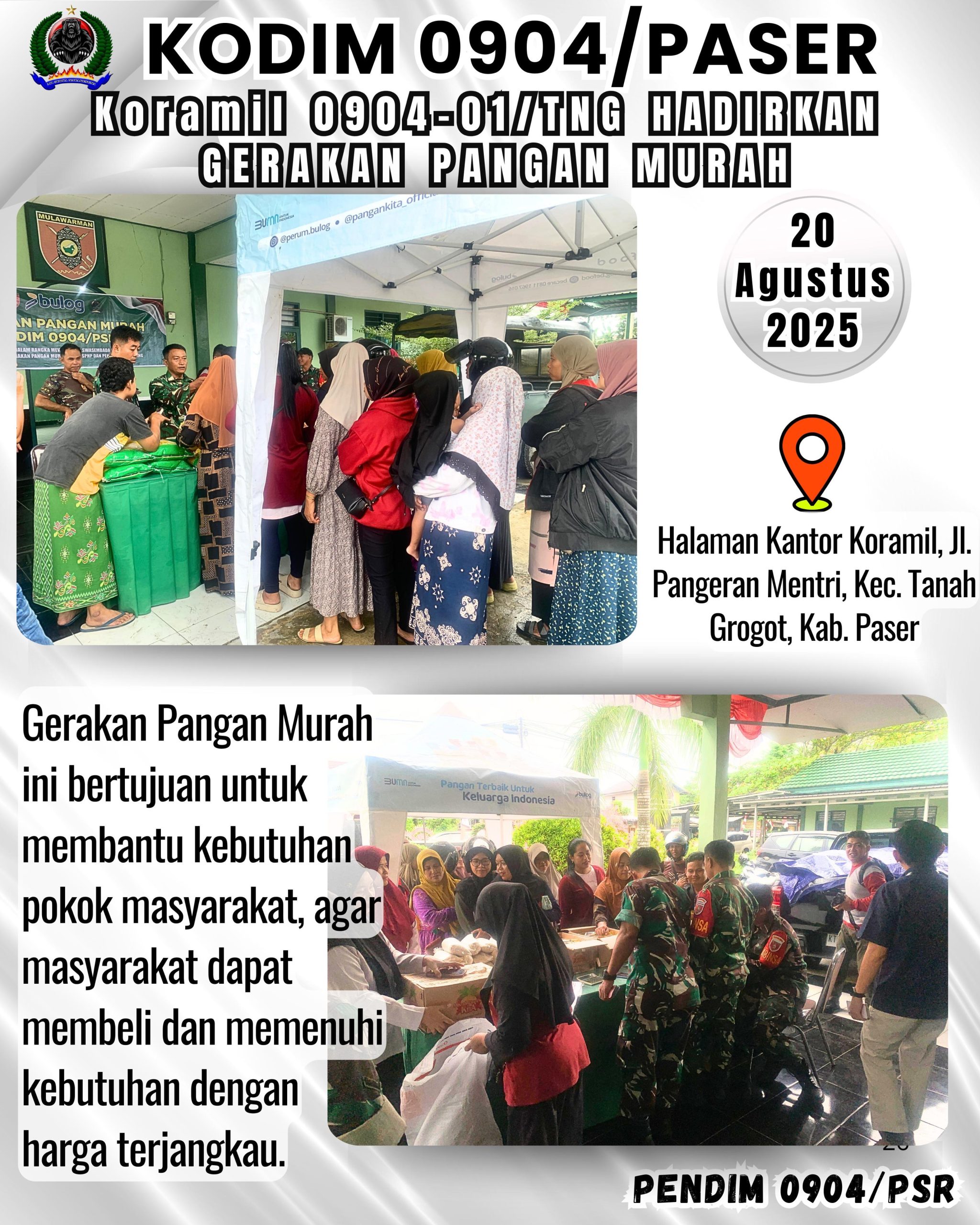 Kodim 0904/Paser, Korem 091/ASN, Kodam VI/Mlw – Bertempat di halaman Koramil 0904-01/Tanah Grogot Kec. Tanah Grogot, Kab. Paser Koramil 0904-01/Tanah Grogot beserta Bulog menggelar Gerakan Pangan Murah(GPM), Rabu (20/8/2025)