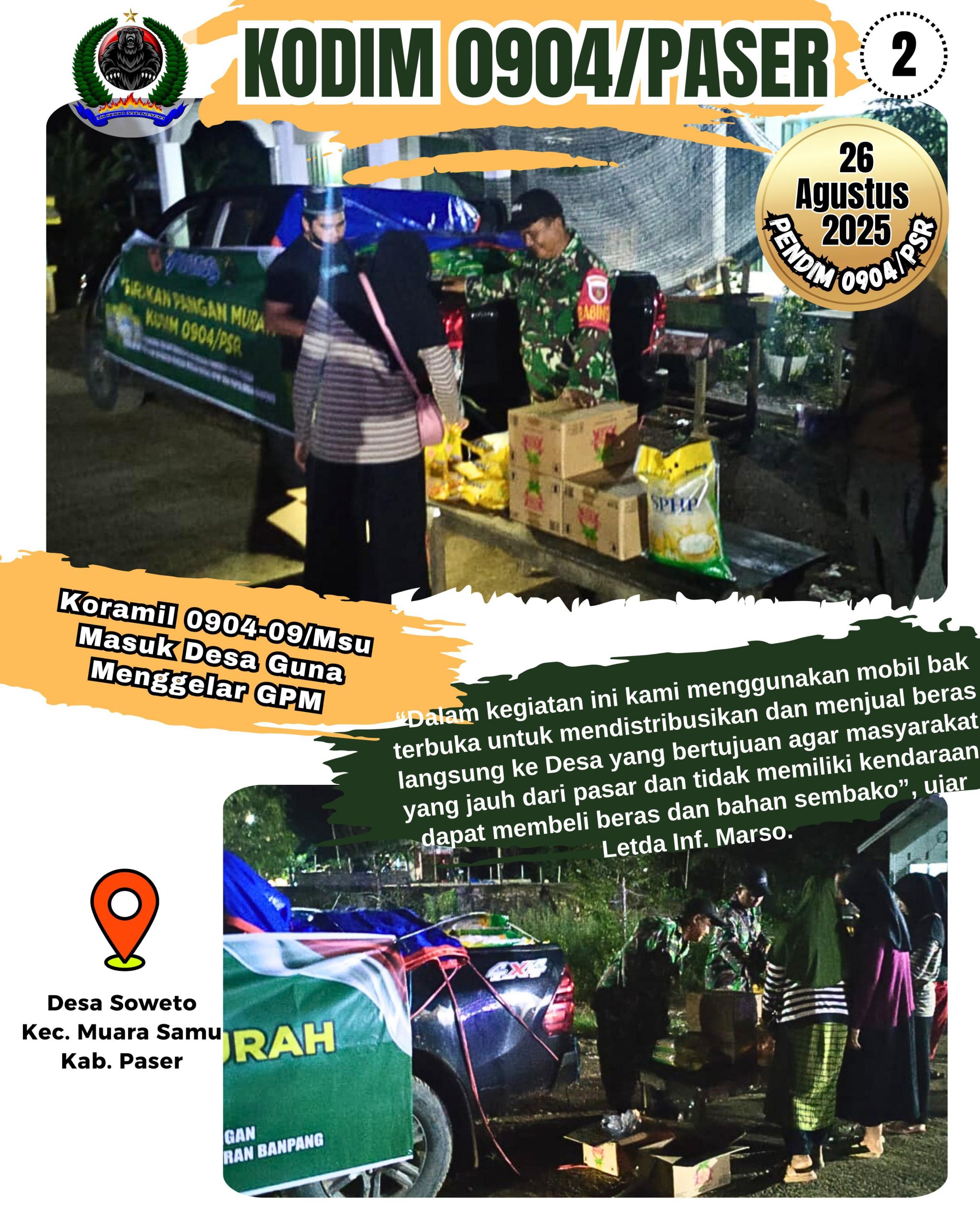 Kodim 0904/Paser, Korem 091/ASN, Kodam VI/Mlw – Koramil 0904-09/Msu bersenegri bersama Bulog menggelar Gerakan Pangan Murah (GPM) sebagai upaya stabilisasi pasokan dan harga pangan beras di Kec. Muara Samu, Kab. Paser, Selasa (26/8/2025)