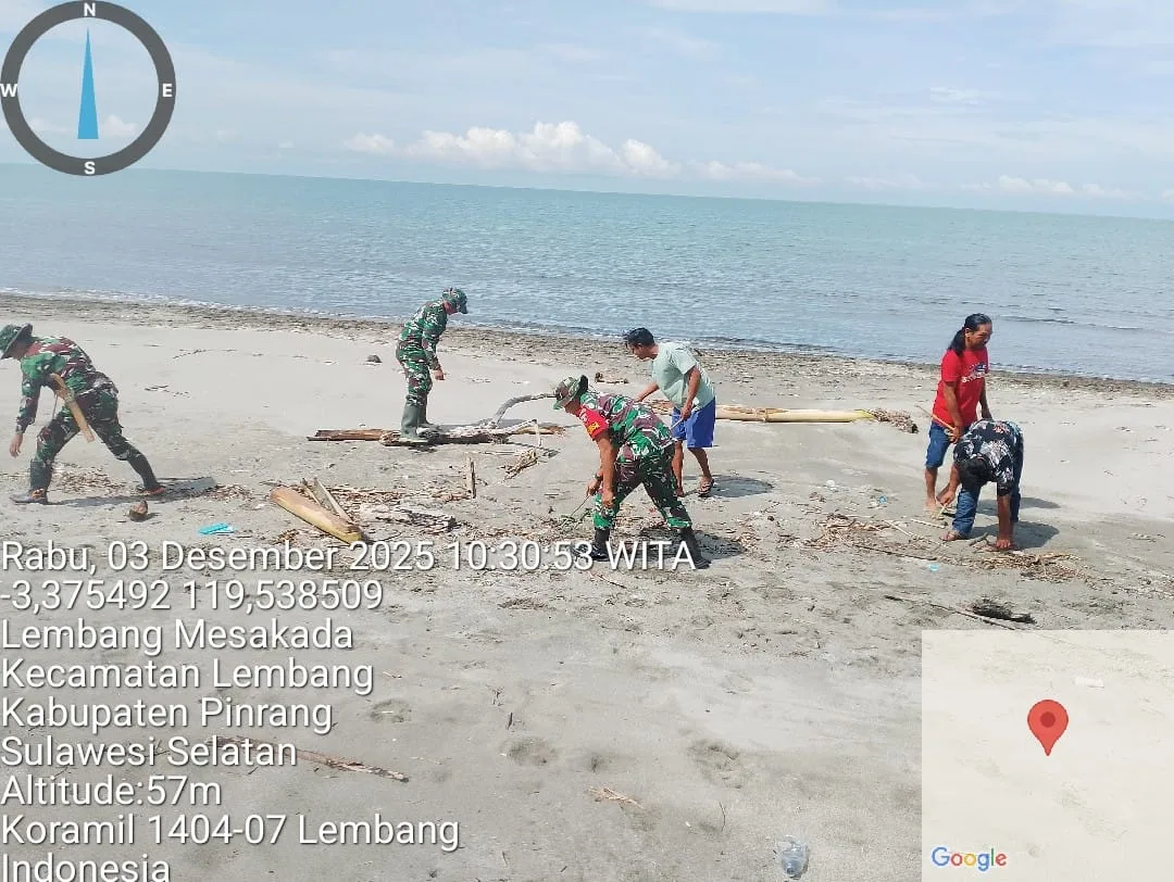 Pinrang_ Dalam rangka menjaga kebersihan lingkungan serta meningkatkan daya tarik wisata daerah, Koramil 1404-07/Lembang Kodim 1404/Pinrang bersama warga melaksanakan kegiatan kerja bakti pembersihan pantai di Desa Sabbangparu, Kecamatan Lembang, Kabupaten Pinrang, Rabu (03/12/2025).