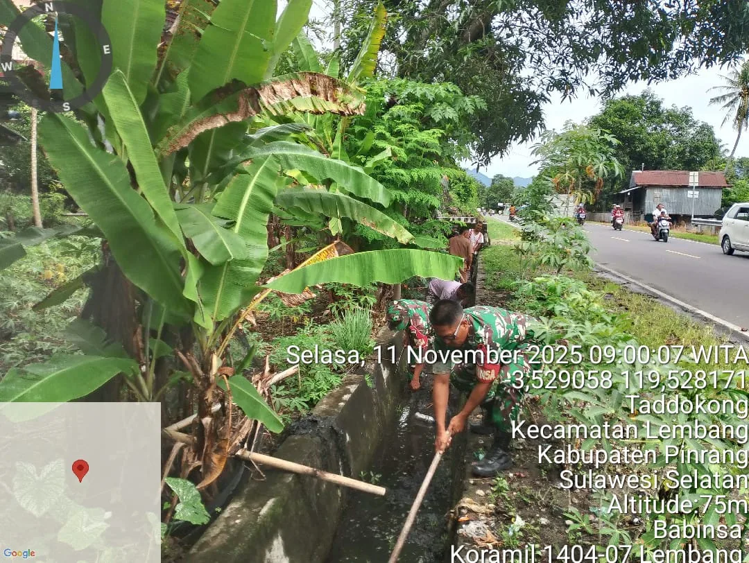 Pinrang_ Personel Koramil 1404-07/Lembang Kodim 1404/Pinrang bersama warga melaksanakan kegiatan kerja bakti pembersihan saluran air di Lingkungan Buttusappa, Kelurahan Tadokkong, Kecamatan Lembang, Kabupaten Pinrang, Selasa (11/11/2025).