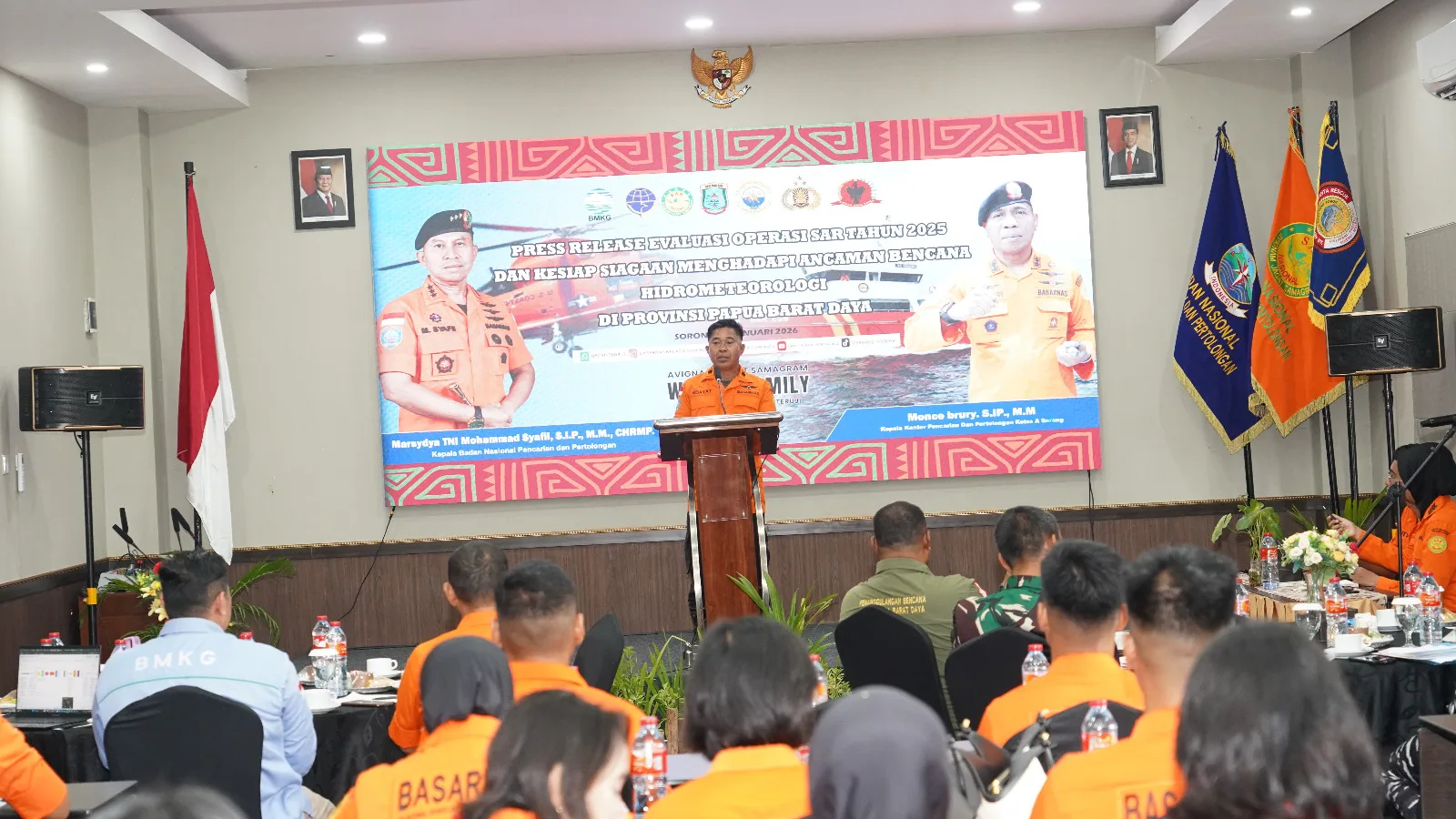 Sorong – Papua Barat Daya Korem 181/PVT menghadiri kegiatan Press Release Evaluasi Operasi SAR dan Kesiapsiagaan Menghadapi Ancaman Bencana Hidrometeorologi yang diselenggarakan oleh Kantor Pencarian dan Pertolongan (Basarnas) Kelas A Sorong, bertempat di Vega Hotel, Jalan Frans Kaisiepo, Kota Sorong, Provinsi Papua Barat Daya, Kamis (15/1/2026).