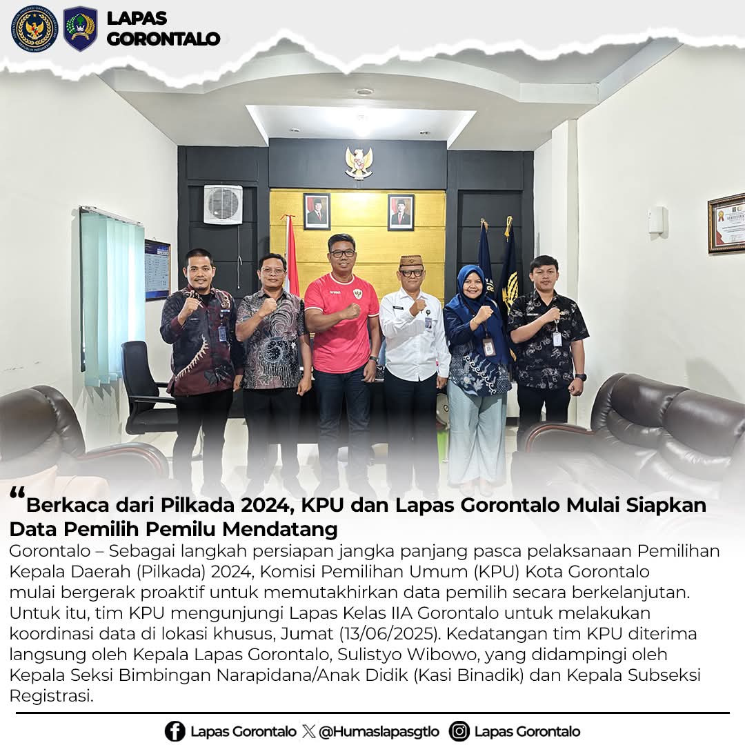 Gorontalo – INFO_PAS : Sebagai langkah persiapan jangka panjang pasca pelaksanaan Pemilihan Kepala Daerah (Pilkada) 2024, Komisi Pemilihan Umum (KPU) Kota Gorontalo mulai bergerak proaktif untuk memutakhirkan data pemilih secara berkelanjutan. Untuk itu, tim KPU mengunjungi Lembaga Pemasyarakatan (Lapas) Kelas IIA Gorontalo untuk melakukan koordinasi data di lokasi khusus, Jumat (13/06/2025). Kedatangan tim KPU diterima langsung oleh Kepala Lapas Gorontalo, Sulistyo Wibowo, yang didampingi oleh Kepala Seksi Bimbingan Narapidana/Anak Didik (Kasi Binadik) dan Kepala Subseksi Registrasi.