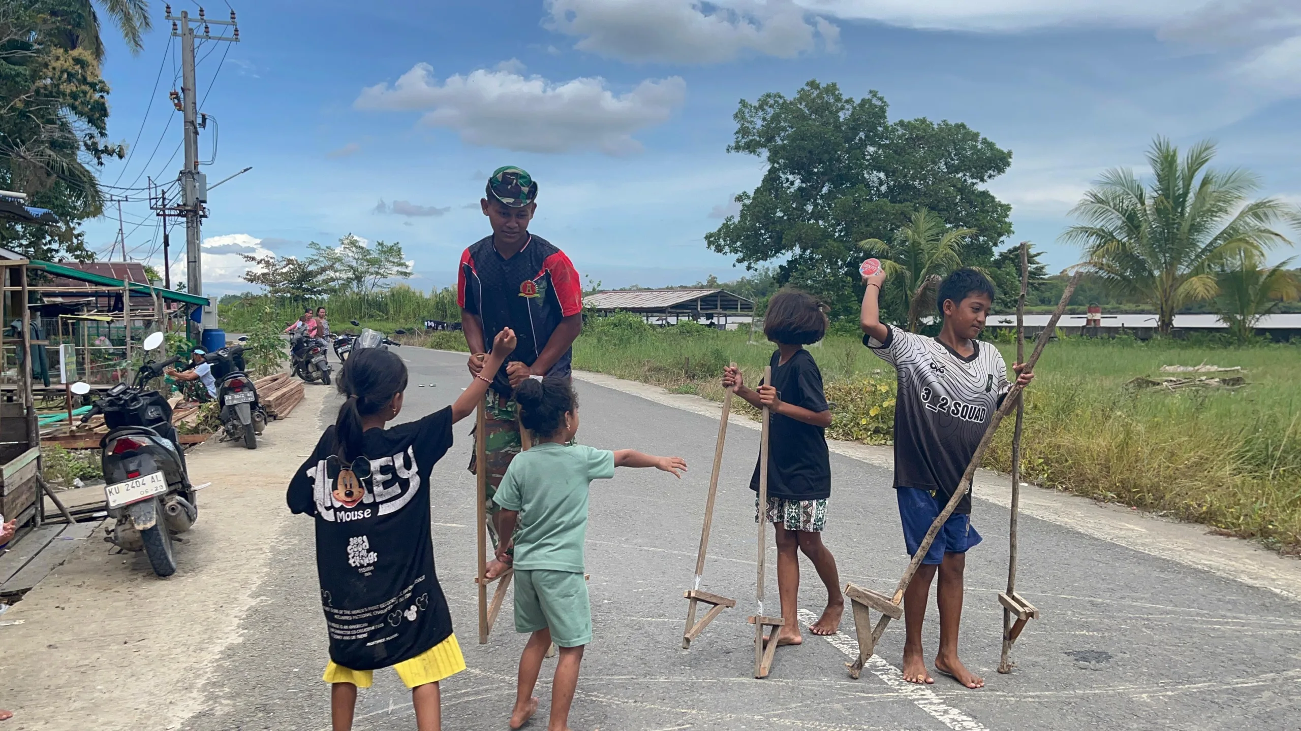 Dengan penuh semangat, Prada Rizky memperagakan cara berjalan menggunakan egrang yang terbuat dari bambu. Anak-anak yang awalnya hanya menonton, perlahan mulai mencoba dengan didampingi dan diarahkan. Tawa riang dan sorak sorai terdengar saat mereka berusaha menjaga keseimbangan agar tidak terjatuh.
