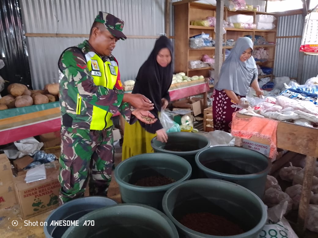 Dalam rangka pengamatan harga tersebut Babinsa Ramil 04/Beutong Kodim 0116/Nagan Raya. Personil Koramil tersebut menyampai kan ajakan kepada masyarakat (penjual)menjaga keamanan wilayah lapak jualan nya.dan selalu menjaga kebersihan lingkungan bersama.pungkas nya.