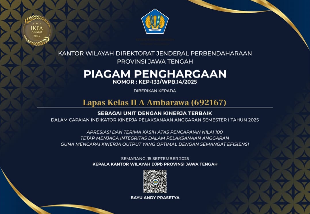 AMBARAWA – Lembaga Pemasyarakatan (Lapas) Kelas IIA Ambarawa menerima penghargaan sebagai unit dengan kinerja terbaik dalam capaian Indeks Kinerja Pelaksanaan Anggaran (IKPA) Semester 1 Tahun 2025 dari Direktorat Jenderal Perbendaharaan Jawa Tengah, Kementerian Keuangan melalui Zoom, rabu (24/09/2025).
