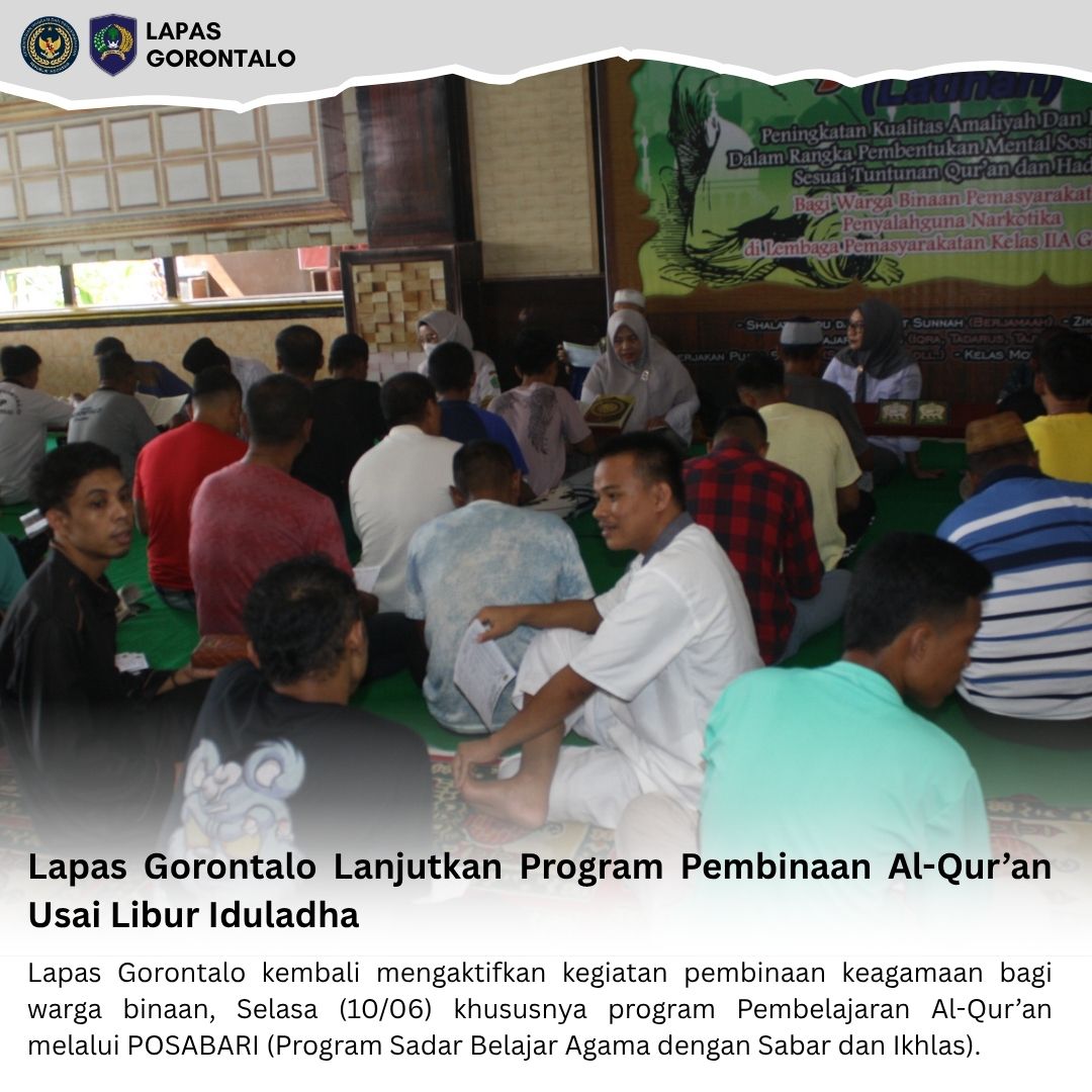 Gorontalo – INFO_PAS – Setelah sukses melaksanakan penyembelihan dan pembagian lima ekor sapi kurban kepada masyarakat sekitar pada Hari Raya Iduladha 1446 H, Lembaga Pemasyarakatan (Lapas) Kelas IIA Gorontalo kembali mengaktifkan kegiatan pembinaan keagamaan bagi warga binaan, Selasa (10/06) khususnya program Pembelajaran Al-Qur’an melalui POSABARI (Program Sadar Belajar Agama dengan Sabar dan Ikhlas).