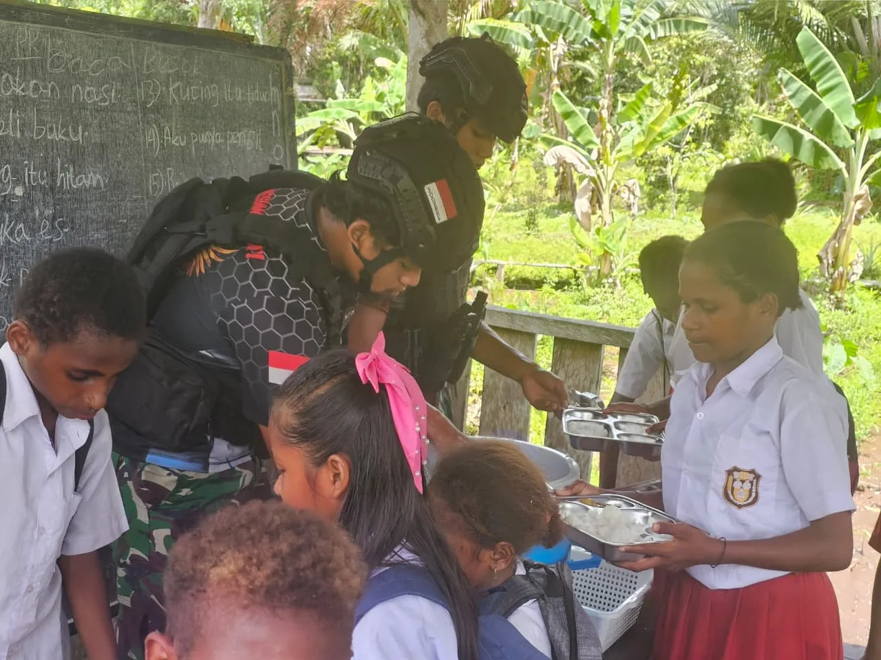 “Anak-anak di sini jarang menikmati makanan bergizi seperti ini. Kehadiran bapak-bapak TNI membuat mereka senang dan termotivasi untuk rajin sekolah,” tutur sang guru penuh haru.