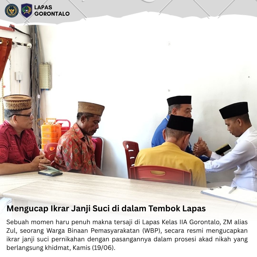 Momen sakral ini menjadi bukti bahwa di balik tembok pembatas, harapan dan cinta tetap tumbuh dan menemukan jalannya. Lapas Gorontalo tidak hanya menjadi tempat pembinaan, tetapi juga ruang untuk memanusiakan manusia dengan tetap menjunjung hak dan nilai-nilai kemanusiaan. Semoga pernikahan ini membawa keberkahan dan menjadi motivasi bagi warga binaan lainnya untuk terus memperbaiki diri dan menata masa depan yang lebih baik.