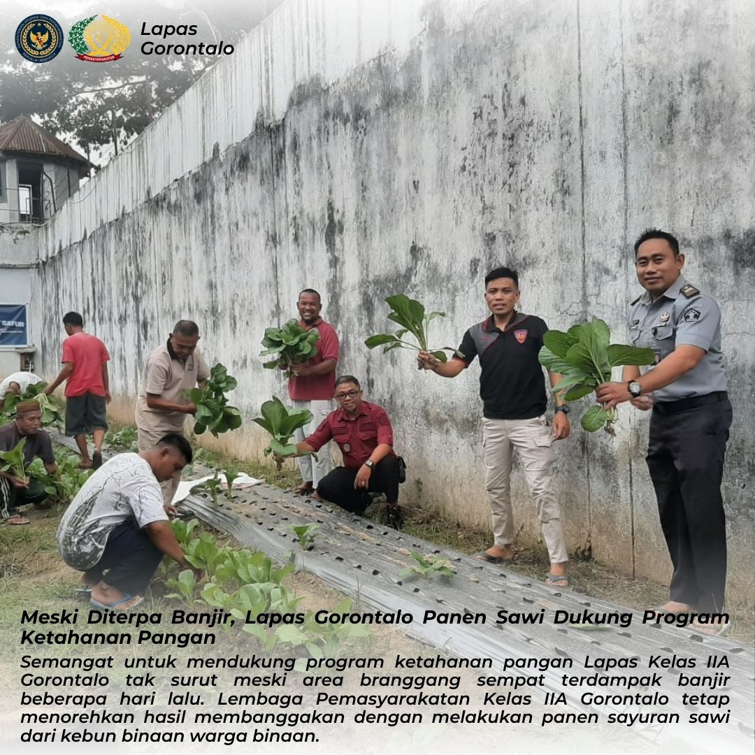 Gorontalo_Rabu (09/04) – Semangat untuk mendukung program ketahanan pangan Lapas Kelas IIA Gorontalo tak surut meski area branggang sempat terdampak banjir beberapa hari lalu. Lembaga Pemasyarakatan Kelas IIA Gorontalo tetap menorehkan hasil membanggakan dengan melakukan panen sayuran sawi dari kebun binaan warga binaan.