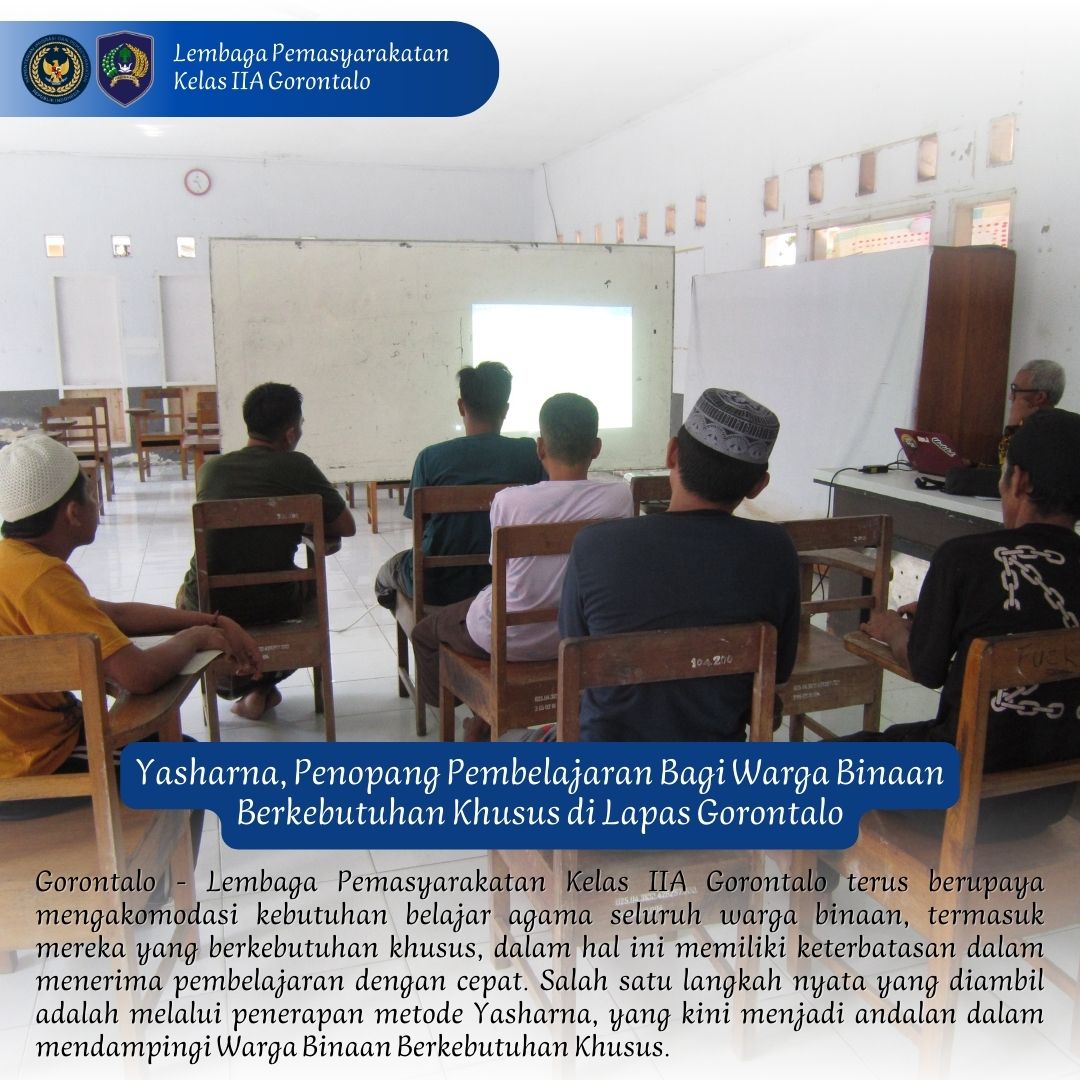 Gorontalo_INFO PAS_Lembaga Pemasyarakatan Kelas IIA Gorontalo terus berupaya mengakomodasi kebutuhan belajar agama seluruh warga binaan, termasuk mereka yang berkebutuhan khusus, dalam hal ini memiliki keterbatasan dalam menerima pembelajaran dengan cepat. Salah satu langkah nyata yang diambil adalah melalui penerapan metode Yasharna, yang kini menjadi Program Unggulan dalam Pendidikan Al-Qur’an bagi Warga Binaan yang Berkebutuhan Khusus.