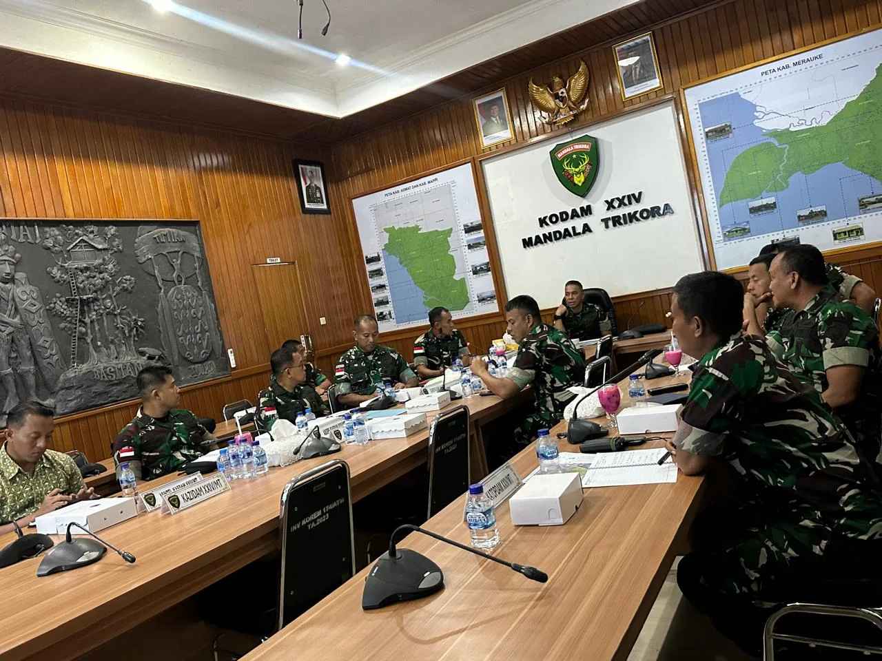 Rapat ini turut dihadiri oleh Pejabat Utama (PJU) Kodam XXIV/Mandala Trikora dan para Asisten Kasdam, sebagai wujud sinergi dan komitmen bersama dalam mendukung kebijakan pimpinan Kodam XXIV/Mandala Trikora.