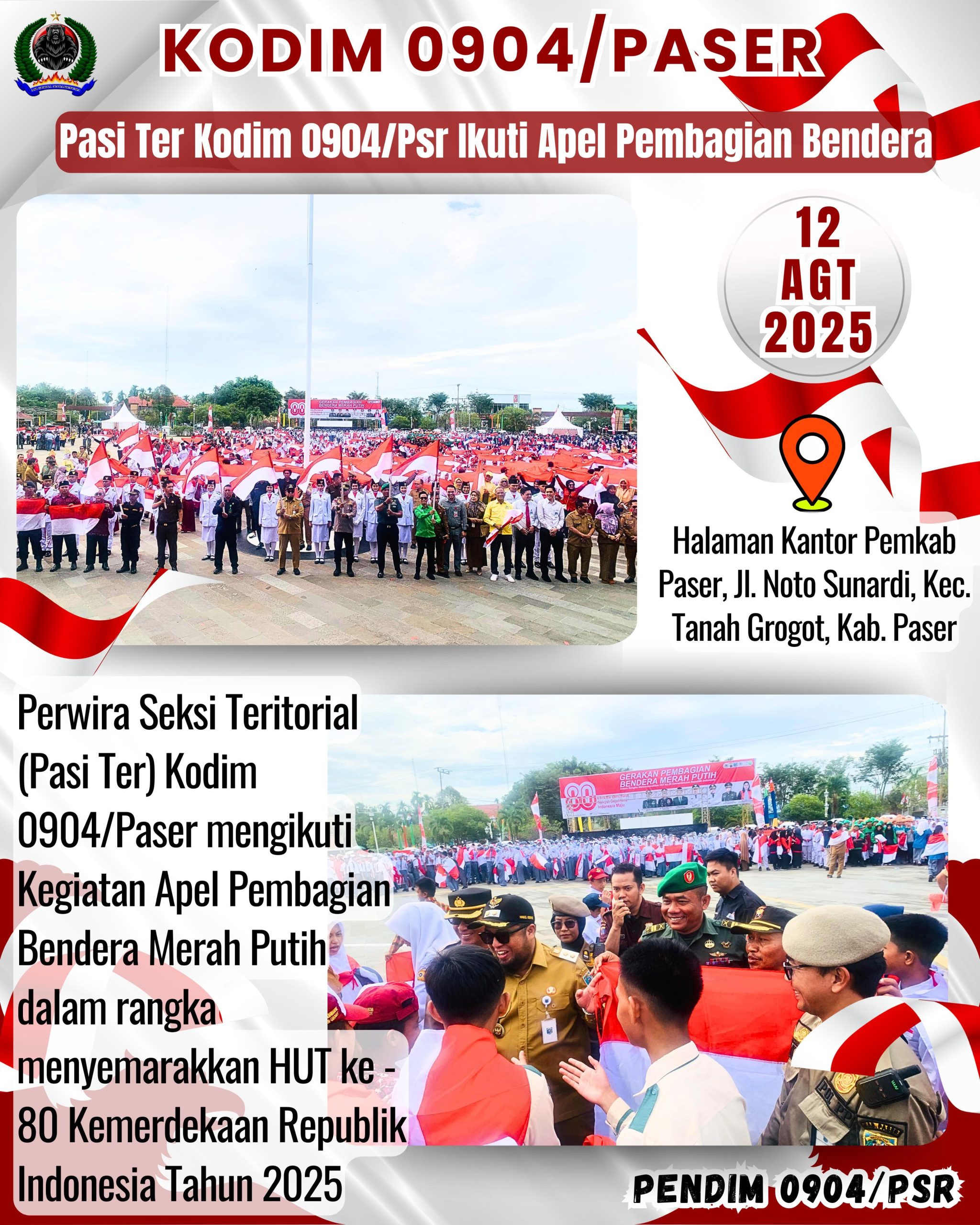 Kodim 0904/Psr, Korem 091/ASN, Kodam VI/Mlw – Perwira Seksi Teritorial (Pasi Ter) Kodim 0904/Paser mengikuti Kegiatan Apel Pembagian Bendera Merah Putih dalam rangka menyemarakkan HUT ke – 80 Kemerdekaan Republik Indonesia Tahun 2025 bertempat di Halaman Kantor Pemkab Paser, Jl. Noto Sunardi, Kec. Tanah Grogot, Kab. Paser, Selasa (12/8/2025).