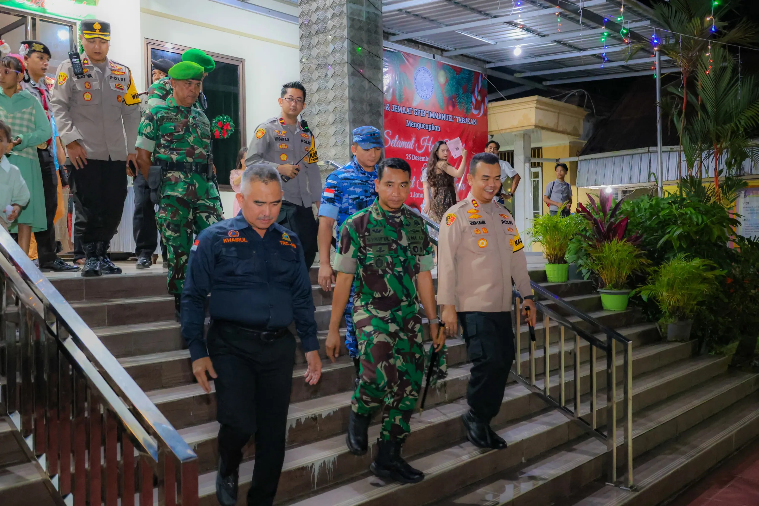 TARAKAN – Komandan Kodim 0907/Trk Letkol Inf Syaiful Arif,S.Sos.,M.Han bersama Walikota Tarakan dr.Khaerul,M.Kes,Kapolres AKBP Erwin S. Manik serta Dansatradar 204 Trk Letkol Lek Tofa Endar Cahyono melaksanakan pengecekan kegiatan pengamanan ibadah Natal di wilayah kota Tarakan,Rabu malam (24/12/2025).