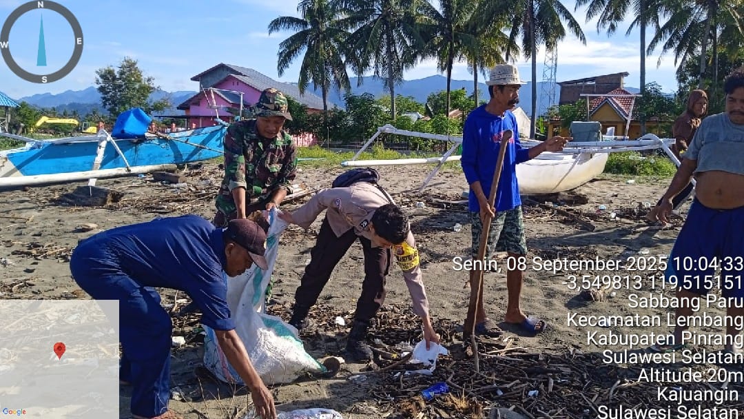 Pinrang_ Peduli terhadap kebersihan pantai, Babinsa jajaran Koramil-07/Lembang Kodim 1404/Pinrang mengajak warga melaksanakan kerja bakti pembersihan pantai di Dusun Kajuangin Desa Sabbang Paru Kecamatan Lembang Kabupaten Pinrang, Senin (09/09/2025).