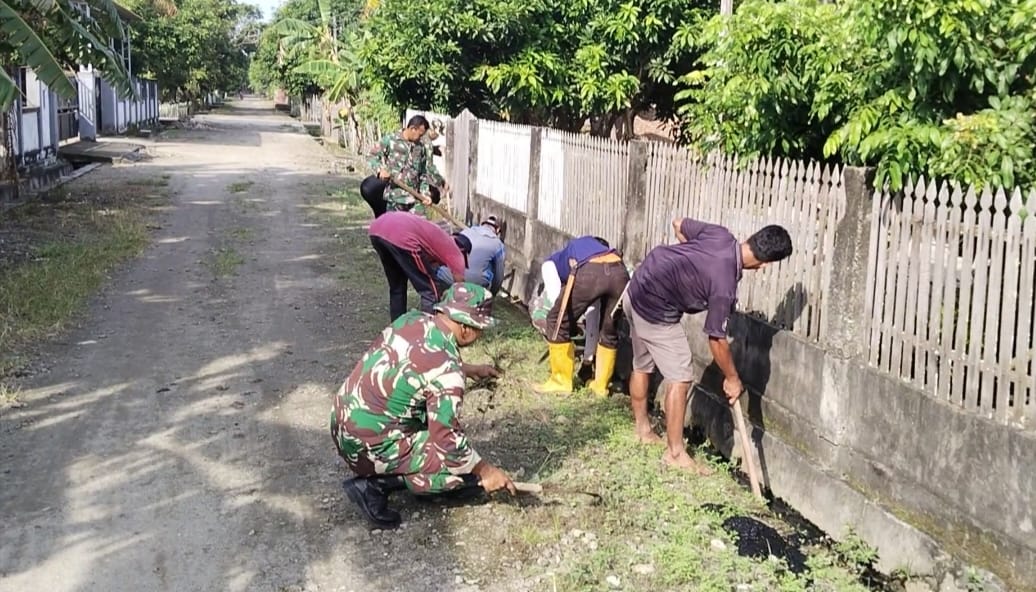 Anggota Koramil-08/Lanrisang bekerjasama dengan warga masyarakat membersihkan saluran air ditepi jalan yang mengalami pendangkalan karena sampah dan tanah, serta ditumbuhi rumput liar.