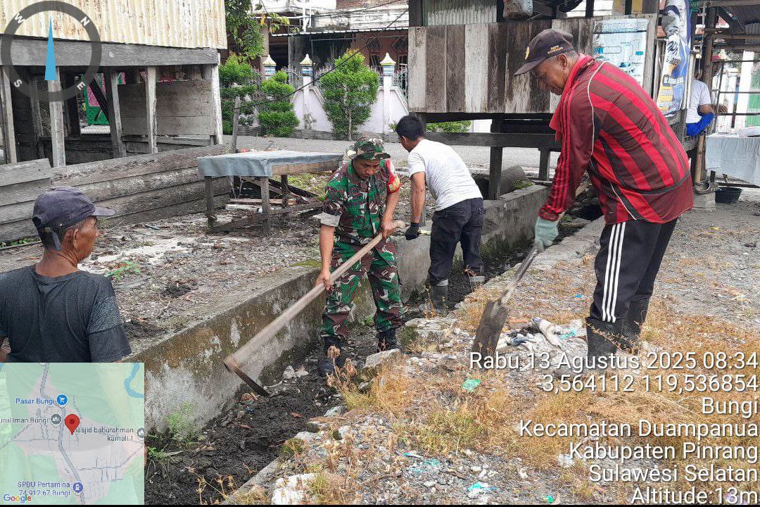 Pinrang_ Sebagai bentuk kepedulian terhadap kebersihan Lingkungan, Babinsa Koramil-06/Duampanua Kodim 1404/Pinrang Serka Hamsir mengajak warga melaksanakan kerja bakti membersihkan saluran air di Dusun Susbater Desa Bungi Kecamatan Duampanua Kabupaten Pinrang, Rabu (13/08/2025).