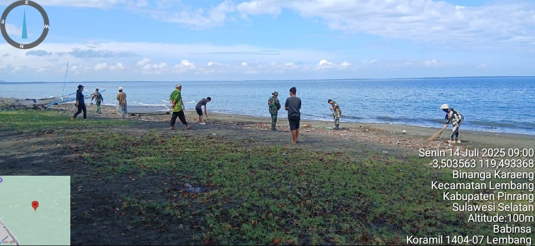 Pinrang_ Peduli terhadap kebersihan pantai, Babinsa Koramil-07/Lembang Kodim 1404/Pinrang bersama pemuda karang taruna dan warga melaksanakan aksi bersih-bersih pantai Salopi di Desa Binanga Karaeng Kecamatan Lembang Kabupaten Pinrang, Selasa (15/07/2025).