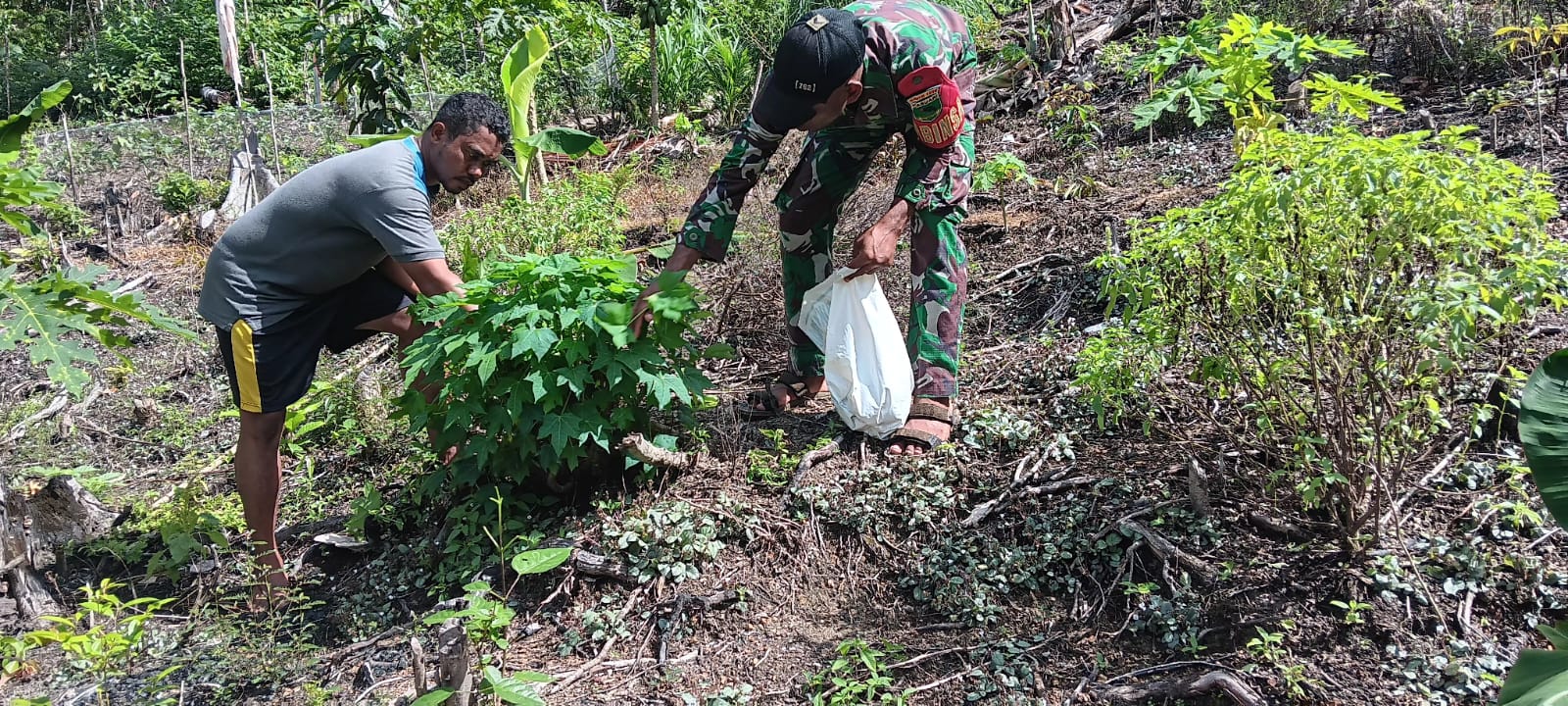Raja Ampat, PBD- Babinsa Koramil 1805-04/Misool, Kodim 1805/Raja Ampat, Serda Syarifudin Nussy Melaksanakan kegiatan Ketahanan Pangan dengan mendampingi sekaligus membantu Petani membersihkan lahan yang akan kembali di tanami Kampung Lilinta, Distrik Misool Barat, Kabupaten Raja Ampat, Kamis (15/05/2025).