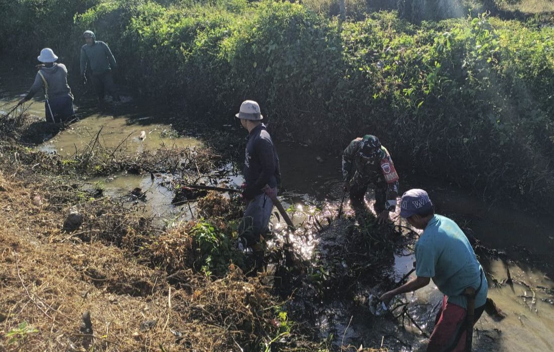 Babinsa Serda Andi Nuralim dalam kesempatan tersebut menyampaikan bahwa saat ini di Kecamatan Tiroang sudah memasuki tahap pengolahan sawah, untuk itu segala kendala yang menghambat para petani dalam pekerjaan bersawah harus diantisipasi dengan baik salah satunya membersihkan saluran irigasi.