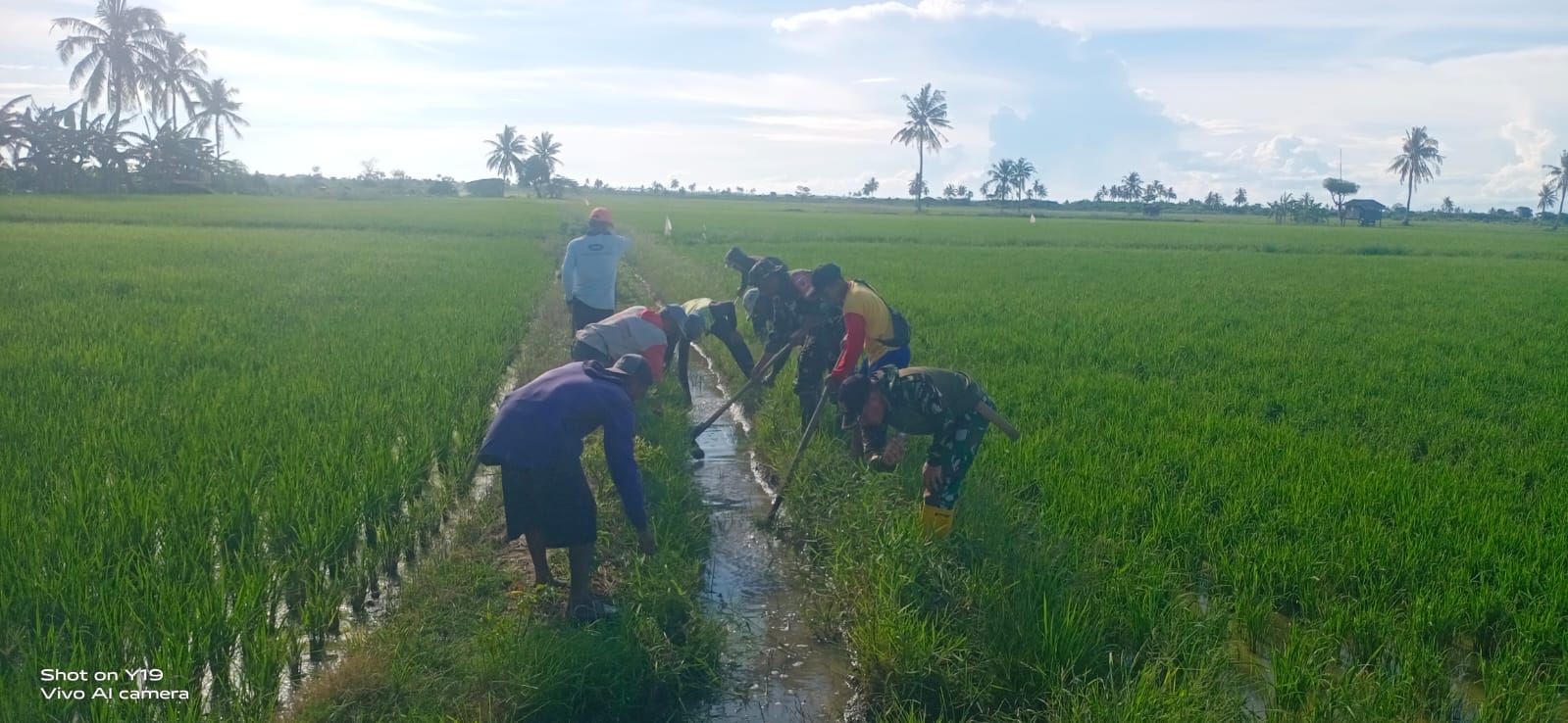 Pinrang_ Babinsa Koramil-02/Mattiro Sompe Kodim 1404/Pinrang bersama warga melaksanakan kerja bakti pembersihan saluran irigasi persawahan di Dusun Tanete Desa Patobong Kecamatan Mattiro Sompe Kabupaten Pinrang, Minggu (20/04/2025).