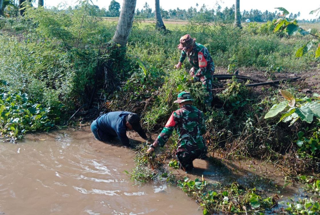 Pinrang_ Demi membantu kelancaran dalam pengolahan lahan pertanian serta mendukung kebutuhan air bagi para petani, Babinsa jajaran Koramil-03/Mattiro Bulu Kodim 1404/Pinrang bersama kelompok tani melaksanakan kerja bakti pembersihan saluran irigasi d Dusun Tanre Assona Desa Padakkalawa Kecamatan Mattiro Sompe Kabupaten Pinrang, Senin (14/04/2025).