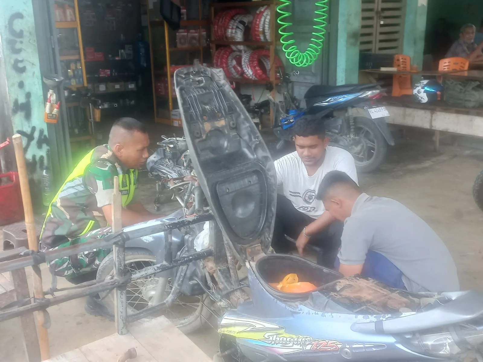 Para pekerja montir menyambut positif kehadiran Babinsa di tempat usaha mereka.